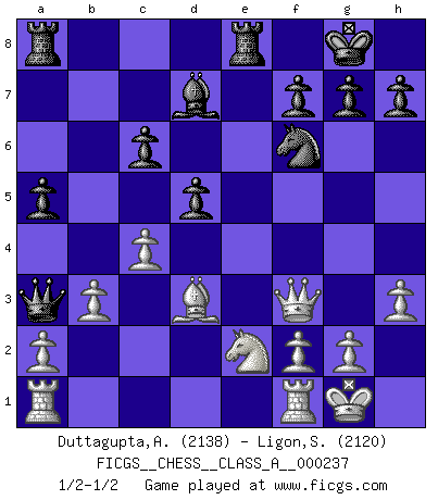 Last move : 1/2-1/2 2021 January 5 20:59:58 [Event "FICGS__CHESS__CLASS_A__000237"] [Site "FICGS"] [Date "2020.09.08"] [Round "1"] [White "Duttagupta,Aniruddha"] [Black "Ligon,Scott"] [Result "1/2-1/2"] [WhiteElo "2138"] [BlackElo "2120"] 1.e4 e5 2.Nf3 Nf6 3.Nc3 Nc6 4.d4 exd4 5.Nxd4 Bb4 6.Nxc6 bxc6 7.Bd3 d5 8.exd5 cxd5 9.O-O O-O 10.h3 c6 11.Qf3 Bd6 12.Bf4 Qc7 13.Bxd6 Qxd6 14.b3 Re8 15.Ne2 Bd7 16.Rad1 Qa3 17.Ra1 a5 18.c4 1/2-1/2 Follow this game move after move (download)Chess is a terrible game. If you have no center, your opponent has a freer position. If you do have a center, then you really have something to worry about ! (Siegbert Tarrasch) Ich würde die 30 stärksten Spieler der USA im Simultanspiel besiegen. (José Raúl Capablanca) Un mal plan es mejor que no tener ningún plan. (Frank Marshall) Le temps de noter son nom sur la feuille de partie, j'étais déjà en zeitnot ! D'un modeste amateur apparié lors de la première ronde d'un open contre le grand-maître Azmaïparashvili. Methinks King Thibault should dub Marius Zubac a knight of the square board... I mean table, henceforth addressing him as Sir Marius, and bestow on him a suitable land from the kingdom of FICGS & marry him off to a worthy, fair maiden, lest he slice our heads with his mighty sword in his wrath. (Dinesh De Silva)