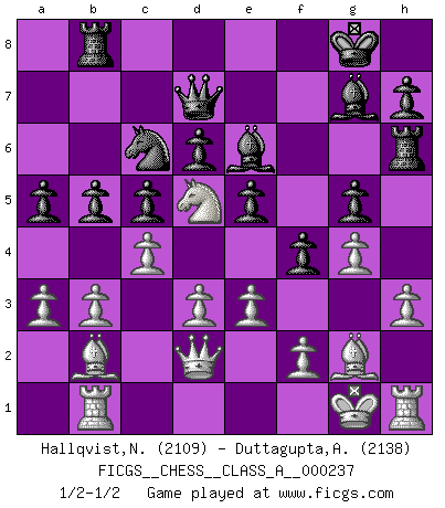 Last move : 1/2-1/2 2021 February 13 15:39:37 [Event "FICGS__CHESS__CLASS_A__000237"] [Site "FICGS"] [Date "2020.09.08"] [Round "1"] [White "Hallqvist,Niklas"] [Black "Duttagupta,Aniruddha"] [Result "1/2-1/2"] [WhiteElo "2109"] [BlackElo "2138"] 1.c4 c5 2.g3 g6 3.Bg2 Bg7 4.Nc3 Nc6 5.e3 e5 6.Nge2 Nge7 7.Rb1 O-O 8.a3 a5 9.d3 d6 10.O-O Rb8 11.Nd5 Bd7 12.Nxe7+ Qxe7 13.Nc3 Bf5 14.h3 Qd7 15.Kh2 Be6 16.Qd2 g5 17.b3 f5 18.Bb2 Rf6 19.Nd5 Rg6 20.Rh1 f4 21.g4 Rh6 22.Kg1 b5 1/2-1/2 Follow this game move after move (download)Best by test: 1. e4 (Bobby Fischer) Dein Körper muss in Topform sein. Dein Schach verfällt, wenn dein Körper verfällt. Der Körper kann nicht vom Geist getrennt werden. (Robert James Fischer) Un juego de Ajedrez es un dialogo, una conversación entre un jugador y su oponente. Cada movimiento del oponente puede contener amenazas o tropiezos, pero un jugador no se puede defender de las amenazas o tomar ventaja de los tropiezos si es que no se pregunta a sí mismo: ¿Que es lo que mi oponente va a hacer después de cada movida?. (Bruce A. Moon) C'est la seule position que je connaisse où les deux camps sont mals. Propos prêtés à V. Anand. Statistics can be made to prove anything - even the truth. (Author unknown)