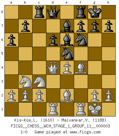 Last move : 1-0 2007 August 29 6:4:8 [Event "FICGS__CHESS__WCH_STAGE_1_GROUP_11__000003"] [Site "FICGS"] [Date "2007.07.11"] [Round "1"] [White "Kis-Kos,Laszlo"] [Black "Malvankar,Vikrant"] [Result "1-0"] [WhiteElo "1610"] [BlackElo "1188"] 1.e4 c5 2.Nf3 d6 3.d4 cxd4 4.Nxd4 Nf6 5.Nc3 a6 6.Be3 e5 7.Nb3 Be7 8.f3 O-O 9.Be2 Be6 10.O-O Nbd7 11.f4 exf4 12.Bxf4 Ne5 13.Qd4 Rc8 14.Rad1 1-0 This chess game has been lost on time (started : 2007.07.11 17:6:20) Sicilian : Najdorf, Byrne (English) attack Kingside Castling by player Black (move 8) Kingside Castling by player White (move 10) Player White won this chess game. Follow this game move after move (download)When you don't know what to do, wait for your opponent to get an idea - it's sure to be wrong. (Tarrasch) Rauchen ist dem Schachspieler bei seiner Arbeit, also im Wettkampf, untersagt. (Viktor Kortschnoi) Ciertamente el estado mental actual de Bobby Fischer es una tragedia. Uno de los mas grandes jugadores de Ajedrez del mundo -el orgullo y pena del Ajedrez Americano. (Frank Brady) Un millionnaire : 'Monsieur Steinitz ! Vous ne participez aux tournois que pour l'argent, alors que moi je n'y viens que pour l'honneur.' Steinitz : 'Chacun joue pour ce qu'il n'a pas'... It's not a bug - it's an undocumented feature. (Anonymous)