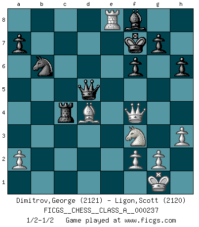 Last move : 1/2-1/2 2021 January 3 10:18:29 [Event "FICGS__CHESS__CLASS_A__000237"] [Site "FICGS"] [Date "2020.09.08"] [Round "1"] [White "Dimitrov,George"] [Black "Ligon,Scott"] [Result "1/2-1/2"] [WhiteElo "2121"] [BlackElo "2120"] 1.e4 e5 2.Nf3 Nf6 3.Nxe5 d6 4.Nf3 Nxe4 5.d4 d5 6.Bd3 Bd6 7.O-O O-O 8.c4 c6 9.Nc3 Nxc3 10.bxc3 dxc4 11.Bxc4 Bf5 12.Re1 Nd7 13.Bd3 Bxd3 14.Qxd3 b5 15.Bd2 h6 16.c4 bxc4 17.Qxc4 Rc8 18.Rad1 Qc7 19.h3 Rfd8 20.Nh4 Bf8 21.Qe2 Nb6 22.Qg4 Qd6 23.Nf3 Qf6 24.Bf4 c5 25.Be5 Qc6 26.dxc5 Rxd1 27.Rxd1 Qxc5 28.Bd4 Qd5 29.Re1 Rc4 30.Re8 f6 31.Qf4 Kf7 1/2-1/2 Follow this game move after move (download)In the perfect Chess combination as in a first-rate short story, the whole plot and counter-plot should lead up to a striking finale, the interest not being allayed until the very last moment. (Yates and Winter) Die FIDE ist dabei in die Hände der russischen Mafia zu fallen. (Larry Evans) Los tropiezos estan todos ahí en el tablero, esperando que se cometan. (Savielly Tartakover) Mon pion favori sur ma case favorite ! Bronstein en parlant d'un coup de pion en h5 quand il avait les Noirs. All art requires courage. (Anne Tucker)