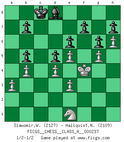 Last move : 1/2-1/2 2020 October 7 23:0:23 [Event "FICGS__CHESS__CLASS_A__000237"] [Site "FICGS"] [Date "2020.09.08"] [Round "1"] [White "Slawomir,Weglicki"] [Black "Hallqvist,Niklas"] [Result "1/2-1/2"] [WhiteElo "2127"] [BlackElo "2109"] 1.e4 e6 2.d4 d5 3.e5 c5 4.c3 Nc6 5.Nf3 Qb6 6.a3 Bd7 7.b4 cxd4 8.cxd4 Rc8 9.Be3 Nh6 10.Bd3 Ng4 11.O-O Nxe3 12.fxe3 Be7 13.Qe1 a6 14.Nc3 Na7 15.Kh1 Qd8 16.Qd2 O-O 17.Rac1 Bc6 18.Qb2 Rc7 19.h3 Qd7 20.h4 Rfc8 21.g4 Qd8 22.g5 Bb5 23.Nxb5 Rxc1 24.Rxc1 Rxc1+ 25.Qxc1 Nxb5 26.Bxb5 axb5 27.h5 g6 28.h6 Kf8 29.Kh2 Ke8 30.Qf1 Qd7 31.Qc1 Kd8 32.Kg3 Qc7 33.Qxc7+ Kxc7 34.Kg4 Kc8 35.Kf4 Bd8 36.Ne1 1/2-1/2 French : Advance, Paulsen attack Kingside Castling by player White (move 11) Kingside Castling by player Black (move 16) This chess game ended in a draw. Follow this game move after move (download)Adequate compensation for a sacrifice is having a sound combination leading to a winning position; adequate compensation for a blunder is having your opponent snatch defeat from the jaws of victory. (Bruce A. Moon) Die Arbeit ist etwas Unnatürliches. Die Faulheit allein ist göttlich. (Anatole France) La mitad de las variaciones que son calculadas en una partida de torneo, resultan ser completamente superfluas. Desafortunadamente, nadie sabe por adelantado cual mitad. (Jan Tinman) Le profane ne songe pas à la somme de jouissance dont il se prive, qui méconnaît ce jeu aux ressources aussi variées que passionnantes. (Jean-Marie Jeanton-Lamarche) First of all, we have to go back to the classical time control. (Anatoly Karpov)