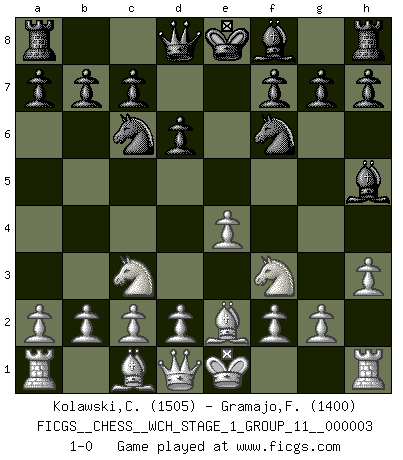 Last move : 1-0 2007 August 29 6:4:8 [Event "FICGS__CHESS__WCH_STAGE_1_GROUP_11__000003"] [Site "FICGS"] [Date "2007.07.11"] [Round "1"] [White "Kolawski,Christof"] [Black "Gramajo,Francisco"] [Result "1-0"] [WhiteElo "1505"] [BlackElo "1400"] 1.e4 e5 2.Nf3 Nf6 3.Nxe5 d6 4.Nf3 Bg4 5.h3 Bh5 6.Nc3 Nc6 7.Be2 1-0 This chess game has been lost on time (started : 2007.07.11 17:6:20) Petrov's defense Player White won this chess game. Follow this game move after move (download)If you aren't afraid of Spassky, then I have removed the element of money. (Jim Slater) Im Reiche der Wirklichkeit ist man nie so glücklich wie im Reiche der Gedanken. (Arthur Schopenhauer) ¿Se han dado cuenta de que Fischer casi nunca ha tenido piezas malas? El las intercambia y las piezas malas se quedan con sus oponenets. (Yuri Balashov) On croit qu'il y a plus de mauvais joueurs que de bons joueurs, c'est faux : Il y a autant de joueurs qui gagnent que de joueurs qui perdent. (Philippe Geluck) Either move or be moved. (Ezra Pound)