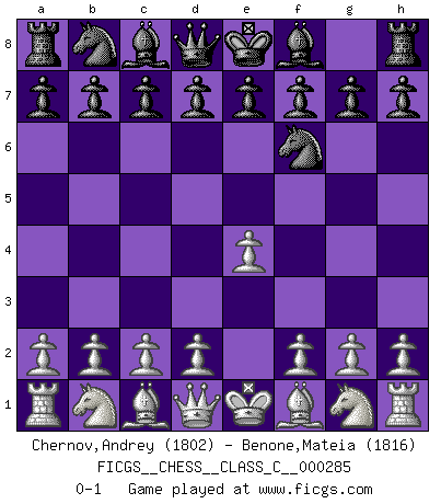 Last move : 0-1 2020 October 21 10:32:55 [Event "FICGS__CHESS__CLASS_C__000285"] [Site "FICGS"] [Date "2020.09.10"] [Round "1"] [White "Chernov,Andrey"] [Black "Benone,Mateia"] [Result "0-1"] [WhiteElo "1802"] [BlackElo "1816"] 1.e4 Nf6 0-1 This chess game has been lost on time (started : 2020.09.10 13:32:51) Alekhine's defense Player Black won this chess game. Follow this game move after move (download)Checkers is for tramps. (Paul Morphy) Ein typischer, sehr verbreiteter Gedankenschädling ist der, daß der betreffende Amateur von der Annanhme ausgeht, daß jeder einzelne Zug etwas zu leisten habe. (Aaron Nimzowitsch) Solo el jugador con la iniciativa tiene el derecho a atacar. (Wilhelm Steinitz) La solitude du joueur d'Echecs à l'approche du mat est semblable à celle du condamné. (Francis Szpiner) When you've done things right people won't know you've done anything at all. (Futurama)