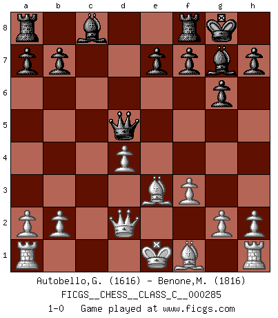 Last move : 1-0 2021 February 14 18:46:27 [Event "FICGS__CHESS__CLASS_C__000285"] [Site "FICGS"] [Date "2020.09.10"] [Round "1"] [White "Autobello,Giovanni"] [Black "Benone,Mateia"] [Result "1-0"] [WhiteElo "1616"] [BlackElo "1816"] 1.e4 c5 2.Nf3 g6 3.d4 cxd4 4.Nxd4 Nc6 5.Nc3 Bg7 6.Be3 Nf6 7.f3 O-O 8.Qd2 d5 9.exd5 Nxd5 10.Nxd5 Qxd5 11.c3 Nxd4 12.cxd4 1-0 This chess game has been lost on time (started : 2020.09.10 13:32:51) Follow this game move after move (download)No Chess Grandmaster is normal; they only differ in the extent of their madness. (Viktor Korchnoi) Nie in meinem Leben habe ich die französische Verteidigung gespielt, welche die Stumpfsinnigste von allen ist. (Wilhelm Steinitz) No solamente yo pronostico su triunfo sobre Botvinnik, sino que me adelanto y digo que probablemente Fischer es el jugador de Ajedrez mas grande que haya existido. (John Collins) Le jeu d'échecs fait naître et fortifie en nous plusieurs qualités précieuses dans le cours de l'existence, telles que la prévoyance, la circonspection, la prudence, et la persévérance. (Benjamin Franklin - 1783, la morale des échecs) Perhaps the current trend of many chess professionals taking up the more lucrative pastime of poker is not a wholly negative one. It may not be too late for humans to relearn how to take risks in order to innovate and thereby maintain the advanced lifestyles we enjoy. And if it takes a poker-playing supercomputer to remind us that we can't enjoy the rewards without taking the risks, so be it. (The Chess Master and the Computer, by Garry Kasparov - 2010)