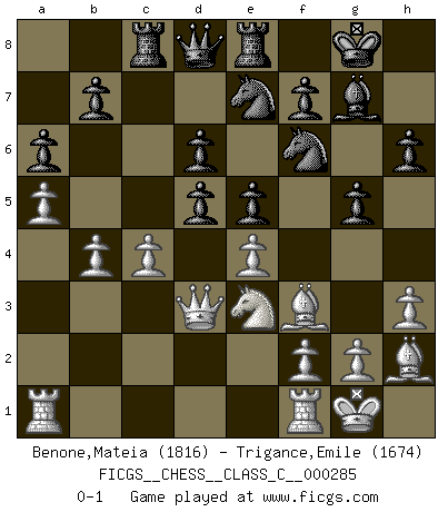 Last move : 0-1 2021 February 19 1:38:28 [Event "FICGS__CHESS__CLASS_C__000285"] [Site "FICGS"] [Date "2020.09.10"] [Round "1"] [White "Benone,Mateia"] [Black "Trigance,Emile"] [Result "0-1"] [WhiteElo "1816"] [BlackElo "1674"] 1.Nf3 d6 2.d4 Bg4 3.Nc3 Nf6 4.Bg5 Nbd7 5.e4 g6 6.Be2 Bg7 7.O-O O-O 8.h3 Bxf3 9.Bxf3 h6 10.Bh4 e5 11.d5 g5 12.Bg3 Nc5 13.b4 Ncd7 14.Bh2 Re8 15.a3 Nb6 16.a4 a6 17.a5 Nbd7 18.Ne2 Rc8 19.Ng3 Nf8 20.Nf5 Ng6 21.Qd3 Ne7 22.Ne3 c6 23.c4 cxd5 0-1 This chess game has been lost on time (started : 2020.09.10 13:32:51) Follow this game move after move (download)Fischer, who may or may not be mad as a hatter, has every right to be horrified. (Jeremy Silman) Ich spiele ehrlich und spiele, um zu gewinnen. Wenn ich verliere nehme ich meine Medizin. (Robert James Fischer) A través de las casillas del tablero, los Indios explican el movimiento del tiempo y la edad, las influencias mas altas que controlan el mundo y los lazos que vinculan al Ajedrez con el alma humana. (Al-Masudi) J'ai vu le vaincu d'Echecs jouer des années durant dans l'espoir de la fête de la victoire. Car tu es plus riche de ce qu'elle existe si même elle n'est point pour toi. Ainsi de la perle du fond des mers. (Antoine de Saint-Exupéry) Mac users swear by their computers. PC users swear at their computers. (Author unknown)