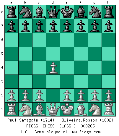 Last move : 1-0 2020 October 21 10:32:55 [Event "FICGS__CHESS__CLASS_C__000285"] [Site "FICGS"] [Date "2020.09.10"] [Round "1"] [White "Paul,Samagata"] [Black "Oliveira,Robson"] [Result "1-0"] [WhiteElo "1714"] [BlackElo "1602"] 1.d4 1-0 This chess game has been lost on time (started : 2020.09.10 13:32:51) Queen's pawn Player White won this chess game. Follow this game move after move (download)When you are lonely, when you feel yourself an alien in the world, play Chess. This will raise your spirits and be your counselor in war. (Aristotle) Gegen einen Schachcomputer zu verlieren ist wie Löcher in den Strümpfen zuhaben. Es ist nicht peinlich, solange man der einzige ist der es weiß. (Anonymous) La única cosa que los jugadores de Ajedrez tienen en común, es el Ajedrez. (Lodewijk Prins) Les erreurs sont comme les malheurs, elles n'arrivent jamais seules. (Siegbert Tarrasch) Computer Science is no more about computers than astronomy is about telescopes. (Edsger W. Dijkstra)