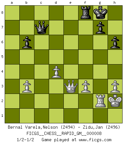 Last move : 1/2-1/2 2021 January 7 15:26:39 [Event "FICGS__CHESS__RAPID_GM__000008"] [Site "FICGS"] [Date "2020.09.15"] [Round "1"] [White "Bernal Varela,Nelson"] [Black "Zidu,Jan"] [Result "1/2-1/2"] [WhiteElo "2494"] [BlackElo "2496"] 1.Nf3 d5 2.d4 Nf6 3.c4 e6 4.e3 b6 5.b3 Bb7 6.cxd5 Nxd5 7.Bb2 Nd7 8.Bc4 Bd6 9.O-O O-O 10.Qe2 Qf6 11.Ba6 Bxa6 12.Qxa6 Nc5 13.Qe2 Ne4 14.Nbd2 Qg6 15.Nxe4 Qxe4 16.h3 h6 17.Rfc1 f5 18.Nd2 Qh4 19.a4 Rf7 20.a5 Raf8 21.axb6 axb6 22.Ba3 Bxa3 23.Rxa3 f4 24.Nf3 Qe7 25.Ra7 fxe3 26.fxe3 Rxf3 27.gxf3 Qg5+ 28.Kh1 Qf5 29.Kh2 e5 30.Rg1 exd4 31.exd4 Qf4+ 32.Rg3 Ne3 33.Rxc7 Qxc7 34.Qxe3 Qc2+ 35.Rg2 Qc7+ 1/2-1/2 Follow this game move after move (download)Examine moves that smite! A good eye for smites is far more important than a knowledge of strategical principles. (Purdy) Ich bin es gewohnt, das die Jugend mir überhaupt keinen Respekt entgegenbringt. (Alexander Morozewich) La estratégia requiere pensar, la táctica requiere observación. (Max Euwe) Les échecs, c'est l'art d'analyser. (Mikhail Botvinnik) There are lots of people who mistake their imagination for their memory. (Josh Bilings)