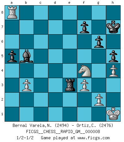 Last move : 1/2-1/2 2020 December 9 11:18:5 [Event "FICGS__CHESS__RAPID_GM__000008"] [Site "FICGS"] [Date "2020.09.15"] [Round "1"] [White "Bernal Varela,Nelson"] [Black "Ortiz,Clodomiro"] [Result "1/2-1/2"] [WhiteElo "2494"] [BlackElo "2476"] 1.Nf3 Nf6 2.d4 d5 3.c4 e6 4.e3 b6 5.b3 Bd6 6.cxd5 exd5 7.Ba3 Bxa3 8.Nxa3 Qe7 9.Nb5 Bb7 10.Bd3 c5 11.O-O O-O 12.Rc1 Nbd7 13.Qe2 a6 14.Nc3 b5 15.dxc5 Nxc5 16.Nd4 g6 17.Rc2 Rac8 18.Rfc1 Nfe4 19.h3 h5 20.Qd1 Rfe8 21.Nxe4 dxe4 22.Bf1 b4 23.Ra1 a5 24.Bc4 Qf6 25.Qf1 Qg5 26.a3 Nd3 27.axb4 Nxb4 28.Rd2 Red8 29.Qe2 Rc5 30.Rad1 Qf6 31.Qe1 Kh7 32.Ne2 Nd3 33.Bxd3 exd3 34.Nf4 Be4 35.f3 Bc6 36.Rxd3 Rxd3 37.Rxd3 Qb2 38.Kh1 Rc2 39.h4 Bb5 40.Rd8 Qc3 41.Qxc3 Rxc3 42.Ra8 Rxe3 1/2-1/2 Follow this game move after move (download)Don't even mention losing to me. I can't stand to think of it. (Bobby Fischer) Die FIDE ist dabei in die Hände der russischen Mafia zu fallen. (Larry Evans) No es tiempo de jugar al Ajedrez cuando la casa esta en llamas. (Proverbio Italiano) Les sacrifices démontrent seulement que quelqu'un a gaffé. (Savielly Tartacover) Rules and bones are meant to be broken. (Anonymous)