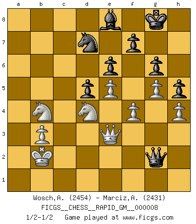 Last move : 1/2-1/2 2020 December 27 0:27:52 [Event "FICGS__CHESS__RAPID_GM__000008"] [Site "FICGS"] [Date "2020.09.15"] [Round "1"] [White "Wosch,Arkadiusz"] [Black "Marciz,Alexander"] [Result "1/2-1/2"] [WhiteElo "2454"] [BlackElo "2431"] 1.e4 c5 2.Nf3 Nc6 3.d4 cxd4 4.Nxd4 e6 5.Nc3 Qc7 6.Be3 a6 7.Qd2 Nf6 8.O-O-O Be7 9.f3 b5 10.Kb1 Ne5 11.g4 b4 12.Na4 h6 13.c4 d6 14.Qxb4 Bd7 15.Qb6 Qc8 16.Qb3 Rb8 17.Qc2 Rb4 18.Nc3 Nxc4 19.Bxc4 Rxc4 20.Qd3 d5 21.e5 Nh7 22.Nce2 O-O 23.h4 Qb7 24.g5 h5 25.b3 g6 26.Ka1 Rb8 27.f4 Nf8 28.Rb1 R4c8 29.Rbc1 Rxc1+ 30.Rxc1 a5 31.Bd2 Ba3 32.Rc2 Qb6 33.Qc3 Ra8 34.Qd3 Rb8 35.Be3 Ra8 36.Bc1 Bxc1 37.Nxc1 a4 38.Kb1 Be8 39.Qc3 Kg7 40.Rb2 axb3 41.axb3 Kg8 42.Ra2 Rxa2 43.Nxa2 Qa6 44.Qe3 Qf1+ 45.Kb2 Nd7 46.Nb4 Qg2+ 1/2-1/2 Follow this game move after move (download)The game of Chess is not merely an idle amusement; several very valuable qualities of the mind are to be acquired and strengthened by it, so as to become habits ready on all occasions; for life is a kind of Chess. (Benjamin Franklin) Besser ein falscher Plan, logisch durchgeführt, als gar kein Plan. (Viktor Kortschnoi) El arma más poderosa en el Ajedrez, es tener la próxima movida. (David Bronstein) Il n'y a plus de joueurs du niveau de Jacob Murray dont la seule quête est le beau jeu, le plaisir de voir les pièces construire quelque chose. Sur 10 idées à la minute, 9 seront sans intérêt, la dernière s'avèrera géniale. (Christian Bauer) Always be a first-rate version of yourself, instead of a second-rate version of somebody else. (Judy Garland)