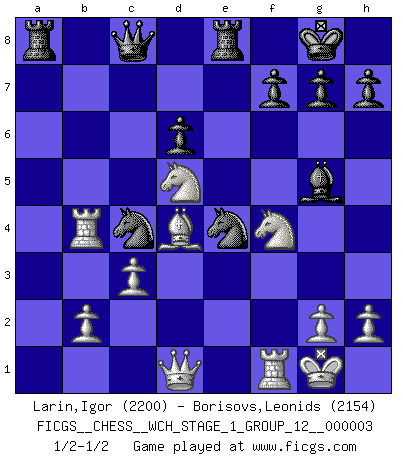 Last move : 1/2-1/2 2007 October 5 21:42:8 [Event "FICGS__CHESS__WCH_STAGE_1_GROUP_12__000003"] [Site "FICGS"] [Date "2007.07.11"] [Round "1"] [White "Larin,Igor"] [Black "Borisovs,Leonids"] [Result "1/2-1/2"] [WhiteElo "2200"] [BlackElo "2154"] 1.e4 c5 2.Nf3 Nc6 3.d4 cxd4 4.Nxd4 e5 5.Nb5 d6 6.N1c3 a6 7.Na3 Be6 8.Nc4 Rc8 9.Ne3 Nf6 10.Be2 Be7 11.O-O O-O 12.Re1 b5 13.a4 b4 14.Ncd5 Nxe4 15.Bxa6 Rb8 16.Bc4 Bh4 17.Rf1 Bg5 18.f3 Nc5 19.f4 exf4 20.Nxf4 Ne5 21.Be2 b3 22.c3 Ra8 23.a5 Re8 24.a6 Bc8 25.Ned5 Bxa6 26.Bxa6 Nxa6 27.Be3 Qb8 28.Ra3 Nc4 29.Rxb3 Qc8 30.Bd4 Nc5 31.Rb4 Ne4 1/2-1/2 Sicilian : Labourdonnais-Loewenthal (Kalashnikov) variation Kingside Castling by player White (move 11) Kingside Castling by player Black (move 11) This chess game ended in a draw. Follow this game move after move (download)Daring ideas are like Chess men moved forward. They may be beaten, but they may start a winning game. (Johann Wolfgang von Goethe) Schach sollte überall auf der Welt Schulfach werden. Es fördert die geistige Auseinandersetzung. Es lehrt die Demut in der Niederlage. (Garry Kasparov) Cuando estes solo, cuando te sientas un extraño en el mundo, juega al Ajedrez. Esto levantará tu espiritu y será tu consejero de guerra. (Aristóteles) Les Echecs mettent en conflit, non pas deux intelligences, mais deux volontés. (Lasker) They say in chess you've got to kill the queen, and then you mate it... Oh I, do you ? (Red Hot Chili Peppers, Fortune faded)