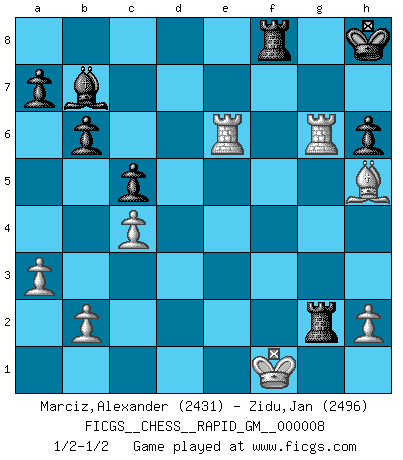 Last move : 1/2-1/2 2020 November 5 3:59:40 [Event "FICGS__CHESS__RAPID_GM__000008"] [Site "FICGS"] [Date "2020.09.15"] [Round "1"] [White "Marciz,Alexander"] [Black "Zidu,Jan"] [Result "1/2-1/2"] [WhiteElo "2431"] [BlackElo "2496"] 1.d4 Nf6 2.c4 e6 3.Nc3 Bb4 4.Qc2 O-O 5.a3 Bxc3+ 6.Qxc3 b6 7.Bg5 Bb7 8.e3 d6 9.f3 Nbd7 10.Bd3 e5 11.e4 c6 12.Nh3 h6 13.Be3 exd4 14.Bxd4 d5 15.O-O dxe4 16.fxe4 c5 17.Bxf6 Nxf6 18.Rae1 Ng4 19.Be2 Nf6 20.e5 Ne4 21.Qe3 Qd4 22.Bf3 Rad8 23.Qxd4 Rxd4 24.Nf4 Re8 25.e6 fxe6 26.Bh5 Rb8 27.Nxe6 Rd2 28.Rf7 Ng5 29.Rxg7+ Kh8 30.Rg6 Rxg2+ 31.Kf1 Nxe6 32.R1xe6 Rf8+ 1/2-1/2 Follow this game move after move (download)A strong memory, concentration, imagination, and a strong will is required to become a great Chess player. (Bobby Fischer) Frage: Was machen Sie mit den Preisen? Anwort: Ich habe Angst, dass meine Freundin davon neue Kleider kauft. (Loek van Wely) Bobby es el jugador de Ajedrez mas fino que este país jamás haya producido. Su memoria para las movidas, su brillantez en soñar combinaciones y su feróz determinación por la victoria son algo extraño. (John Collins) Les erreurs sont comme les malheurs, elles n'arrivent jamais seules. (Siegbert Tarrasch) Methinks King Thibault should dub Marius Zubac a knight of the square board... I mean table, henceforth addressing him as Sir Marius, and bestow on him a suitable land from the kingdom of FICGS & marry him off to a worthy, fair maiden, lest he slice our heads with his mighty sword in his wrath. (Dinesh De Silva)