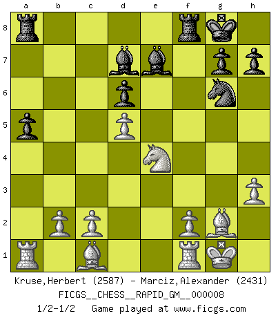Last move : 1/2-1/2 2020 November 4 17:53:19 [Event "FICGS__CHESS__RAPID_GM__000008"] [Site "FICGS"] [Date "2020.09.15"] [Round "1"] [White "Kruse,Herbert"] [Black "Marciz,Alexander"] [Result "1/2-1/2"] [WhiteElo "2587"] [BlackElo "2431"] 1.Nf3 c5 2.e4 Nc6 3.d4 cxd4 4.Nxd4 Nf6 5.Nc3 e5 6.Ndb5 d6 7.Nd5 Nxd5 8.exd5 Nb8 9.a4 Be7 10.Be2 O-O 11.O-O Nd7 12.a5 a6 13.Nc3 f5 14.Be3 Rb8 15.Na4 b5 16.axb6 f4 17.Bc1 e4 18.Nc3 f3 19.gxf3 exf3 20.Bxf3 Ne5 21.Bg2 Qxb6 22.h3 a5 23.Ne4 Ng6 24.Qd2 Ra8 25.Qe3 Qc7 26.Qc3 Qxc3 27.Nxc3 Bd7 28.Ne4 1/2-1/2 Follow this game move after move (download)Life is like a game of Chess, changing with each move. (Chinese proverb) Heutzutage gewinnt im Turnier nicht derjenige Spieler, der weitreichende Pläne entwirft, sondern einfach jener, der Zug um Zug kämpft. (David Bronstein) Fischer es el jugador mas fuerte del mundo. De hecho, el jugador mas fuerte que jamas haya existido. (Larry Evans) Même si vous avez un bon coup à faire, regardez toujours s'il n'y en a pas un qui lui soit préférable. (Pedro Damiano) The best teachers teach from the heart, not from the book. (Author unknown)