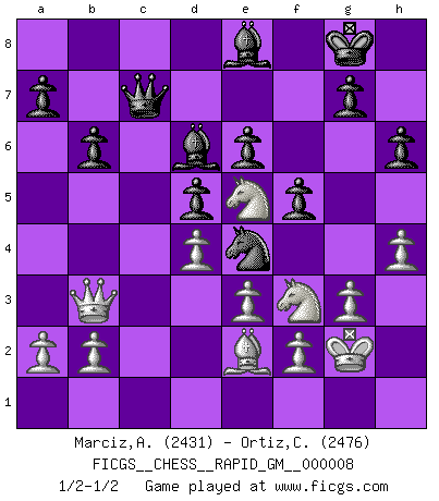 Last move : 1/2-1/2 2020 November 2 15:25:47 [Event "FICGS__CHESS__RAPID_GM__000008"] [Site "FICGS"] [Date "2020.09.15"] [Round "1"] [White "Marciz,Alexander"] [Black "Ortiz,Clodomiro"] [Result "1/2-1/2"] [WhiteElo "2431"] [BlackElo "2476"] 1.d4 Nf6 2.c4 e6 3.Nf3 d5 4.g3 Bb4+ 5.Bd2 Be7 6.Bg2 c6 7.Qc2 b6 8.Bf4 O-O 9.O-O Nbd7 10.Rd1 Ba6 11.Nbd2 Nh5 12.Be3 Nhf6 13.Rac1 Ng4 14.Qd3 Rc8 15.h4 h6 16.Bf4 f5 17.Bh3 Ndf6 18.Be5 Re8 19.Bxf6 Nxf6 20.Qb3 Bd6 21.cxd5 cxd5 22.Bf1 Qd7 23.Ne5 Qb7 24.Qe3 Kh7 25.Ndf3 Ne4 26.Rxc8 Rxc8 27.Rc1 Bb5 28.Kg2 Rc7 29.Rxc7 Qxc7 30.Qb3 Be8 31.e3 Kg8 32.Be2 Kf8 33.Qd1 Kg8 34.Qb3 1/2-1/2 Queen's pawn game Kingside Castling by player Black (move 8) Kingside Castling by player White (move 9) This chess game ended in a draw. Follow this game move after move (download)Chess is a terrible game. If you have no center, your opponent has a freer position. If you do have a center, then you really have something to worry about ! (Siegbert Tarrasch) Modernes Schach erfordert enorme Anspannung. Es ist für einen normalen Menschen unmöglich das auszuhalten. (Viktor Kortschnoi) Tu sabes, camarada Pachman, no disfruto el ser un Ministro, preferería jugar al Ajedrez como tu. (Che Guevara) Demandez au pauvre Cg1 ce qu'il en pense. Eduard Gufeld à propos de la variante Saemisch de l'Est-Indienne. Life is painting a picture, not doing a sum. (Oliver Wendell Holmes, Jr.)