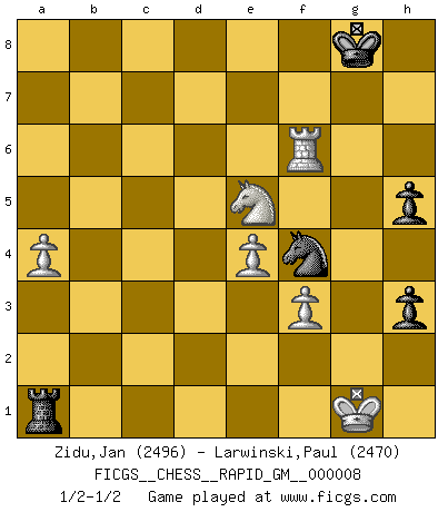 Last move : 1/2-1/2 2020 September 20 17:53:49 [Event "FICGS__CHESS__RAPID_GM__000008"] [Site "FICGS"] [Date "2020.09.15"] [Round "1"] [White "Zidu,Jan"] [Black "Larwinski,Paul"] [Result "1/2-1/2"] [WhiteElo "2496"] [BlackElo "2470"] 1.e4 e5 2.Nf3 Nc6 3.Bc4 Bc5 4.c3 Nf6 5.d3 d6 6.O-O h6 7.Re1 a6 8.a4 O-O 9.h3 Ba7 10.Nbd2 Re8 11.b4 Be6 12.Bxe6 Rxe6 13.Qc2 Qd7 14.Nf1 d5 15.Be3 d4 16.cxd4 Nxd4 17.Nxd4 Bxd4 18.Bxd4 Qxd4 19.Qxc7 Qxd3 20.Qxb7 Qd8 21.Red1 Qb8 22.Qxb8+ Rxb8 23.f3 Rxb4 24.Ne3 Rb2 25.Rab1 Ra2 26.Rb8+ Kh7 27.Nf5 g6 28.Nd6 Re7 29.Rdb1 Nh5 30.R1b7 Rxb7 31.Rxb7 Nf4 32.Nxf7 Rxg2+ 33.Kf1 Ra2 34.Nxe5 Kg8 35.Rb6 g5 36.Rxa6 h5 37.h4 gxh4 38.Kg1 h3 39.Rf6 Ra1+ 1/2-1/2 Giuoco Piano Kingside Castling by player White (move 6) Kingside Castling by player Black (move 8) This chess game ended in a draw. Follow this game move after move (download)The King is a fighting piece. Use it ! (Wilhelm Steinitz) Der zweitbeste Zug ist oft der einzig richtige. (Savielly Grigorievitsch Tartakower) El Ajedrez moderno está demasiado preocupado con cosas como la estructura de Peones. Olvidenlo, el Jaque Mate termina la partida. (Nigel Short) Seul un grand joueur sait à quel point il joue faiblement. (Xavier Tartacover) Never risk one's whole fortune unless supported by one's entire army. (Niccolo Machiavelli)