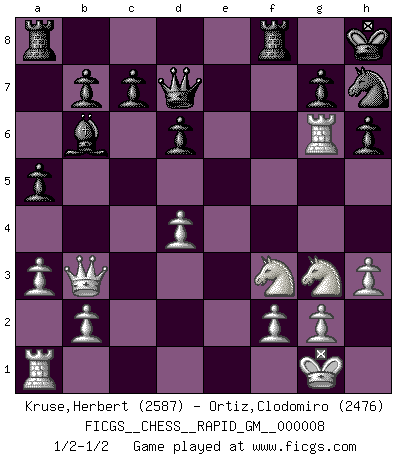 Last move : 1/2-1/2 2020 October 21 22:27:5 [Event "FICGS__CHESS__RAPID_GM__000008"] [Site "FICGS"] [Date "2020.09.15"] [Round "1"] [White "Kruse,Herbert"] [Black "Ortiz,Clodomiro"] [Result "1/2-1/2"] [WhiteElo "2587"] [BlackElo "2476"] 1.e4 e5 2.Nf3 Nc6 3.Bc4 Bc5 4.O-O Nf6 5.d3 d6 6.c3 O-O 7.h3 a5 8.Re1 h6 9.Bb5 Ba7 10.Nbd2 Nh7 11.Nf1 f5 12.exf5 Bxf5 13.Ng3 Bg6 14.d4 exd4 15.cxd4 Nb4 16.Ba4 Bb6 17.Bb3+ Kh8 18.a3 Nd3 19.Re6 Nxc1 20.Rxg6 Nxb3 21.Qxb3 Qd7 1/2-1/2 Giuoco Piano Kingside Castling by player White (move 4) Kingside Castling by player Black (move 6) This chess game ended in a draw. Follow this game move after move (download)Chess is above all, a fight ! (Emanuel Lasker) Es war undenkbar für die Behörden, dass ein sowjetischer Großmeister auf diese Art und Weise [Fischer-Taimanov 6:0] verliert, ohne dass es eine politischer Erklärung dafür gäbe. (Mark Taimanov) Me gusta decir que Bobby Fischer fue el mejor jugador que jamás haya existido. Pero lo que hizo de Fischer un genio, fue su habilidad de mezclar una frescura y pragmatismo Americano con ideas Rusas acerca de la estrategia. (Bruce Pandolfini) Celui qui prend des risques peut perdre, celui qui n'en prend pas perd toujours. (Xavier Tartacover) Even the best needles are not sharp at both ends. (Chinese proverb)