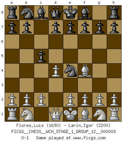 Last move : 0-1 2007 August 17 16:8:34 [Event "FICGS__CHESS__WCH_STAGE_1_GROUP_12__000003"] [Site "FICGS"] [Date "2007.07.11"] [Round "1"] [White "Flores,Luis"] [Black "Larin,Igor"] [Result "0-1"] [WhiteElo "1690"] [BlackElo "2200"] 1.d4 Nf6 2.Bg5 Ne4 3.Bf4 c5 0-1 This chess game has been lost on time (started : 2007.07.11 17:7:55) Trompowsky attack (Ruth, Opovcensky Opening) Player Black won this chess game. Follow this game move after move (download)An attack on the wing should be met by play in the center. (Nimzovitch) Ich verstehe den Grund nicht, warum die Aufteilung in Frauen und Männer überhaupt im Schach besteht. (Judith Polgar) El Ajedrez detiene a su maestro dentro de sus propios vínculos, encadenando la mente y el cerebro, por lo que la libertad interior del mas fuerte debe sufrir. (Albert Einstein) Mon pion favori sur ma case favorite ! Bronstein en parlant d'un coup de pion en h5 quand il avait les Noirs. When I took office, only high energy physicists had ever heard of what is called the World Wide Web... Now even my cat has its own page. (Bill Clinton, 1996)