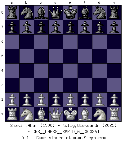 Last move : 0-1 2020 October 16 13:35:9 [Event "FICGS__CHESS__RAPID_A__000261"] [Site "FICGS"] [Date "2020.09.16"] [Round "1"] [White "Shakir,Akam"] [Black "Kuliy,Oleksandr"] [Result "0-1"] [WhiteElo "1900"] [BlackElo "2025"] 0-1 This chess game has been lost on time (started : 2020.09.16 10:54:28) Player Black won this chess game. Follow this game move after move (download)Up to this point White has been following well-known analysis. But now he makes a fatal error: he begins to use his own head. (Siegbert Tarrasch) Wenn ein Kopf und ein Buch zusammenstoßen und es klingt hohl, ist es denn allemal im Buche? (Georg Christoph Lichtenberg) Prefiero perder una partida realmente buena, que ganar una mala. (David Levy) Comme les marins qui ont mille raisons différentes d'aller en mer, les joueurs d'échecs en ont tout autant avant de s'installer devant une table et jouer... (Vincent Bertignac, philosophe) The difference between perseverance and obstinacy is that one comes from a strong will, and the other from a strong won't. (Henry Ward Beecher)