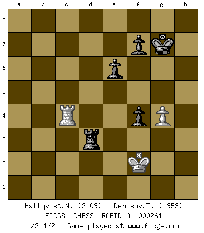 Last move : 1/2-1/2 2020 October 30 11:36:7 [Event "FICGS__CHESS__RAPID_A__000261"] [Site "FICGS"] [Date "2020.09.16"] [Round "1"] [White "Hallqvist,Niklas"] [Black "Denisov,Timofey"] [Result "1/2-1/2"] [WhiteElo "2109"] [BlackElo "1953"] 1.c4 c5 2.g3 Nc6 3.Bg2 g6 4.Nf3 Bg7 5.Nc3 e6 6.h4 h6 7.O-O Nge7 8.a3 d5 9.d3 O-O 10.Bd2 b6 11.Rb1 a5 12.Nb5 Bd7 13.Qc1 Kh7 14.b4 cxb4 15.axb4 Nxb4 16.Bxb4 axb4 17.Rxb4 dxc4 18.dxc4 Qc8 19.Rd1 Qc5 20.Rb1 Bc6 21.e3 Be4 22.Nd2 Bxg2 23.Kxg2 Ra2 24.Nf3 Nf5 25.Rd2 Ra4 26.e4 Rxc4 27.Qe1 Ne7 28.Nd6 Rc3 29.Qe2 Qc6 30.Qb5 Nc8 31.Qxc6 Rxc6 32.Nxc8 Rfxc8 33.e5 Rb8 34.Rd7 Kg8 35.Rb5 Bf8 36.Nd2 Rc5 37.Rxc5 Bxc5 38.Ne4 Kf8 39.Nxc5 bxc5 40.Rc7 Rb5 41.Kf3 Rb3+ 42.Ke2 Rb5 43.Kd3 Rb2 44.Ke3 Rc2 45.Kf3 Rc3+ 46.Ke4 Kg7 47.Rc6 g5 48.hxg5 hxg5 49.Rc8 Rc1 50.Kf3 Rc4 51.g4 Rf4+ 52.Kg3 c4 53.f3 Rd4 54.Kf2 Rd5 55.Rxc4 Rxe5 56.Kg3 Rd5 57.f4 Rd3+ 58.Kf2 gxf4 1/2-1/2 English : Symmetrical variation Kingside Castling by player White (move 7) Kingside Castling by player Black (move 9) 10 pieces endgame at move 55 : White KRPPP , Black KRPPP WHITE : King + 1 Rook 3 Pawns BLACK : King + 1 Rook 3 Pawns 9 pieces endgame at move 55 : White KRPP , Black KRPPP WHITE : King + 1 Rook 2 Pawns BLACK : King + 1 Rook 3 Pawns 8 pieces endgame at move 58 : White KRP , Black KRPPP WHITE : King + 1 Rook 1 Pawn BLACK : King + 1 Rook 3 Pawns This chess game ended in a draw. Follow this game move after move (download)I'd rather have a Pawn than a finger. (Reuben Fine) Man kann eine Schachpartie nur gewinnen, wenn das Gleichgewicht gestört ist. In einer Stellung mit ungestörtem Gleichgewicht ist auch das größte Genie hilflos - in der Stellung steckt dann eben kein genialer Einfall. (Wilhelm Steinitz) A la fecha, Fischer esta simplemente un nivel arriba de todos los mejores jugadores de Ajedrez del mundo. (John Jacobs) La vie est comme un jeu d'échecs : nous esquissons un plan, mais celui-ci est tributaire de ce que daignent faire l'adversaire aux échecs et le destin dans la vie. (Arthur Schopenhauer) Control your own destiny or someone else will. (Jack Welch)