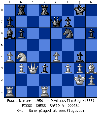 Last move : 0-1 2020 October 21 15:34:2 [Event "FICGS__CHESS__RAPID_A__000261"] [Site "FICGS"] [Date "2020.09.16"] [Round "1"] [White "Faust,Dieter"] [Black "Denisov,Timofey"] [Result "0-1"] [WhiteElo "1956"] [BlackElo "1953"] 1.Nf3 Nf6 2.c4 e6 3.d4 d5 4.g3 Bb4+ 5.Bd2 Be7 6.Bg2 O-O 7.O-O c6 8.Qc2 Nbd7 9.Bf4 b6 10.Rd1 Ba6 11.Ne5 Rc8 12.cxd5 cxd5 13.Nc6 Nh5 14.Bc1 Nb8 15.Nxe7+ Qxe7 16.Nc3 Rfd8 17.b3 Nf6 18.Bb2 Nc6 19.Qd2 h6 20.f3 e5 21.dxe5 Nxe5 22.Bh3 Rb8 23.a4 Qc5+ 24.Kg2 d4 25.Na2 d3 26.Bxe5 Qxe5 27.e4 g5 28.Qc3 Qe7 29.Nb4 g4 0-1 Reti Opening Kingside Castling by player Black (move 6) Kingside Castling by player White (move 7) Player Black won this chess game. Follow this game move after move (download)If cunning alone were needed to excel, women would be the best Chess players. (Albin) Ich kämpfe solange mein Gegner einen Fehler machen kann. (Emanuel Lasker) Puntos débiles o agujeros en la posición de tu oponente deben de ser ocupados por piezas, no Peones. (Siegbert Tarrasch) La vie et les Echecs sont tous les deux une lutte constante. (Lasker) That's absurd. I love it. (Gregory House, House M.D.)