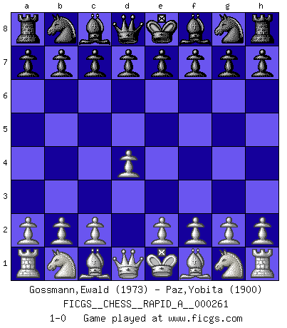 Last move : 1-0 2020 October 16 13:35:9 [Event "FICGS__CHESS__RAPID_A__000261"] [Site "FICGS"] [Date "2020.09.16"] [Round "1"] [White "Gossmann,Ewald"] [Black "Paz,Yobita"] [Result "1-0"] [WhiteElo "1973"] [BlackElo "1900"] 1.d4 1-0 This chess game has been lost on time (started : 2020.09.16 10:54:28) Queen's pawn Player White won this chess game. Follow this game move after move (download)The tactician knows what to do when there is something to do; whereas the strategian knows what to do when there is nothing to do. (Gerald Abrahams) Es ist im Leben wie im Schachspiel. Wir entwerfen einen Plan, dieser bleibt jedoch bedingt durch das, was im Schachspiel dem Gegner, im Leben dem Schicksal zu tun belieben wird. (Arthur Schopenhauer) Me dio la sensación de como si yo estuviera jugando en contra del mismo Ajedrez. - al estar jugando en contra de Robert Fischer (Walter Shipman) Les Echecs ont trois composantes : le temps, l'espace et le matériel en dernier. (Mikhail Tal) Luck is what you have left over after you give 100 percent. (Langston Coleman)
