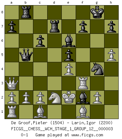 Last move : 0-1 2007 September 29 12:46:5 [Event "FICGS__CHESS__WCH_STAGE_1_GROUP_12__000003"] [Site "FICGS"] [Date "2007.07.11"] [Round "1"] [White "De Groof,Pieter"] [Black "Larin,Igor"] [Result "0-1"] [WhiteElo "1504"] [BlackElo "2200"] 1.e4 e5 2.f4 exf4 3.Nf3 g5 4.h4 g4 5.Ne5 Nf6 6.d4 d6 7.Nd3 Nc6 8.d5 Be7 9.Nd2 Ne5 10.Nxf4 g3 11.Nd3 c6 12.Nxe5 dxe5 13.Qf3 Bc5 14.Qxg3 Ng4 15.Qb3 Bf2+ 16.Ke2 O-O 17.dxc6 Be6 18.Qb4 bxc6 19.Rh3 Rb8 20.Qa3 Qb6 21.h5 Rfd8 22.Rg3 Rd7 23.Rf3 Qb5+ 0-1 KGA : Kieseritsky, Berlin defense Kingside Castling by player Black (move 16) Player Black won this chess game. Follow this game move after move (download)Chess is a forcing house where the fruits of character can ripen more fully than in life. (Edward Morgan Foster) Besser ein falscher Plan, logisch durchgeführt, als gar kein Plan. (Viktor Kortschnoi) La belleza de un movimiento no se refleja solo en su apariencia, sino en el pensamiento detrás de él. (Siegbert Tarrasch) Une platitude souvent récitée à propos des Echecs est qu'une des choses les plus difficiles à réaliser est de gagner une position gagnante. Cela ne manque pas de sens mais, pour ma part, j'ai toujours trouvé plus difficile de gagner une position perdante. (Tim Krabbe) Fear is the path to the dark side. Fear leads to anger; anger leads to hate; hate leads to suffering. I sense much fear in you. (Master Yoda in Star Wars ep.1)