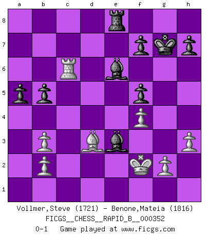 Last move : 0-1 2020 November 30 20:28:14 [Event "FICGS__CHESS__RAPID_B__000352"] [Site "FICGS"] [Date "2020.09.18"] [Round "1"] [White "Vollmer,Steve"] [Black "Benone,Mateia"] [Result "0-1"] [WhiteElo "1721"] [BlackElo "1816"] 1.d4 d5 2.c4 dxc4 3.e3 e5 4.Bxc4 exd4 5.Qb3 Qe7 6.Nf3 Qb4+ 7.Bd2 Qxb3 8.axb3 dxe3 9.Bxe3 Bb4+ 10.Nc3 Nf6 11.O-O O-O 12.Nd5 Nxd5 13.Bxd5 Nd7 14.Bd4 Nf6 15.Bxf6 gxf6 16.Rfd1 c6 17.Bc4 Kg7 18.h3 a5 19.Nd4 Rd8 20.Nc2 Rxd1+ 21.Rxd1 Be7 22.Ne3 f5 23.f4 b5 24.Bd3 Bc5 25.Kf2 Be6 26.Rc1 Bd4 27.Rxc6 Re8 28.Rd6 Bc5 29.Rc6 Bxe3+ 0-1 Follow this game move after move (download)Chess teaches you to control the initial excitement you feel when you see something that looks good and it trains you to think objectively when you're in trouble. (Stanley Kubrick) Wenn Capablanka heute auf der Schachbühne erscheinen würde, hätte er ein halbes Jahr gebraucht um sich die Schachtheorie anzueignen. Und dann hätte er alles und jeden besiegt. (Mikhail Moiseyevich Botvinik) Yo he agregado estos principios a la ley: pongan los Caballos en acción antes de que los dos Alfiles sean desarrollados. (Emanuel Lasker) Une platitude souvent récitée à propos des Echecs est qu'une des choses les plus difficiles à réaliser est de gagner une position gagnante. Cela ne manque pas de sens mais, pour ma part, j'ai toujours trouvé plus difficile de gagner une position perdante. (Tim Krabbe) We cannot be sure of having something to live for unless we are willing to die for it. (Ernesto Che Guevara)