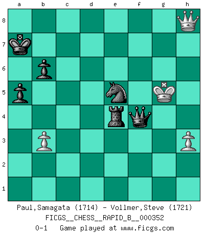 Last move : 0-1 2020 September 25 4:26:50 [Event "FICGS__CHESS__RAPID_B__000352"] [Site "FICGS"] [Date "2020.09.18"] [Round "1"] [White "Paul,Samagata"] [Black "Vollmer,Steve"] [Result "0-1"] [WhiteElo "1714"] [BlackElo "1721"] 1.d4 d5 2.c4 e6 3.Nc3 Nf6 4.e3 Be7 5.Nf3 O-O 6.b3 c5 7.Bb2 Nc6 8.cxd5 exd5 9.Be2 Bf5 10.O-O b6 11.Nh4 Be6 12.Qc2 Rc8 13.Qd2 Ne4 14.Nxe4 dxe4 15.d5 Qxd5 16.Qxd5 Bxd5 17.Nf5 Bf6 18.Bxf6 gxf6 19.Rfd1 Rfd8 20.Bg4 Be6 21.Kf1 Kf8 22.Ke2 Ne5 23.Bh3 c4 24.Rxd8+ Rxd8 25.Nd4 Bxh3 26.gxh3 cxb3 27.axb3 a5 28.Rc1 Rd6 29.Rc7 Ke8 30.Rb7 Nd7 31.f3 exf3+ 32.Kxf3 Kd8 33.Ra7 Kc8 34.Kf4 Kb8 35.Nb5 Rd3 36.h4 Rd5 37.h3 h6 38.e4 Rd3 39.h5 Ne5 40.Nd4 Kxa7 41.Kf5 Rxd4 42.Kxf6 Rxe4 43.Kg7 f5 44.Kxh6 f4 45.Kg5 f3 46.h6 f2 47.h7 f1Q 48.h8Q Qf4+ 0-1 QGD : 3...Nf6 Kingside Castling by player Black (move 5) Kingside Castling by player White (move 10) 10 pieces endgame at move 44 : White KPPP , Black KRNPPP WHITE : King + 3 Pawns BLACK : King + 1 Rook 1 Knight 3 Pawns Promotion Queen by player Black (move 47) Promotion Queen by player White (move 48) Player Black won this chess game. Follow this game move after move (download)Chess holds its master in its own bonds, shackling the mind and brain so that the inner freedom of the very strongest must suffer. (Albert Einstein) Kleine Schachspieler machen Mist, und große Schachspieler machen Mist, aber große machen weniger Mist. (Fritz Sämisch) El Ajedrez es 99 por ciento táctica. (Teichmann) Les pièces de l'échiquier étaient impitoyables. Elles le retenaient, elles l'absorbaient. Il y avait de l'horreur en cela, mais aussi une harmonie unique. Car, qu'y a-t-il dans le monde, à part les échecs ? (V. Nabokov) Better than a thousand days of diligent study is one day with a great teacher. (Japanese proverb)