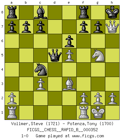 Last move : 1-0 2020 September 27 1:56:5 [Event "FICGS__CHESS__RAPID_B__000352"] [Site "FICGS"] [Date "2020.09.18"] [Round "1"] [White "Vollmer,Steve"] [Black "Potenza,Tony"] [Result "1-0"] [WhiteElo "1721"] [BlackElo "1700"] 1.d4 d5 2.c4 Nf6 3.cxd5 Nxd5 4.e4 Nf6 5.e5 Nd5 6.Nc3 Nb6 7.Nf3 e6 8.Bd3 Bb4 9.O-O O-O 10.Qc2 Nc6 11.Be3 Bxc3 12.bxc3 Qd5 13.Bxh7+ Kh8 14.Be4 Qa5 15.Ng5 Nxe5 16.dxe5 Nc4 17.Bd5 Qxd5 18.Qh7+ 1-0 QGD : Marshall defense Kingside Castling by player White (move 9) Kingside Castling by player Black (move 9) Player White won this chess game. Follow this game move after move (download)We must make sure that Chess will not be like a dead language, very interesting, but for a very small group. (Sytze Faber) Den Ruhm habe ich schon, jetzt brauche ich noch das Geld. (Wilhelm Steinitz) El Ajedrez es el gimnasio de la mente. (Blaise Pascal) On peut tirer plus d'utilité d'une partie perdue que de 100 parties gagnées. (Capablanca) The real danger is not that computers will begin to think like men, but that men will begin to think like computers. (Sydney J. Harris)