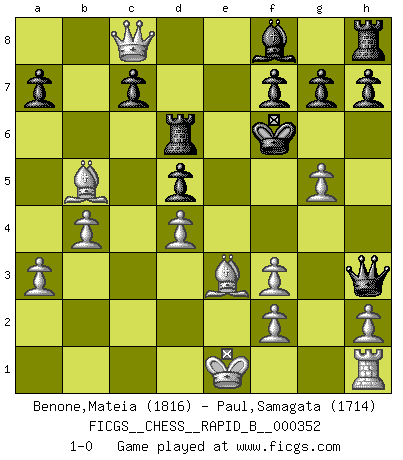 Last move : 1-0 2020 October 9 7:8:41 [Event "FICGS__CHESS__RAPID_B__000352"] [Site "FICGS"] [Date "2020.09.18"] [Round "1"] [White "Benone,Mateia"] [Black "Paul,Samagata"] [Result "1-0"] [WhiteElo "1816"] [BlackElo "1714"] 1.Nf3 d5 2.d4 Nc6 3.c4 Bg4 4.cxd5 Bxf3 5.exf3 Qxd5 6.Be3 O-O-O 7.Nc3 Qa5 8.a3 Nf6 9.b4 Qh5 10.Rc1 e6 11.Qa4 Nd5 12.Nxd5 exd5 13.Rxc6 bxc6 14.Qxc6 Rd6 15.Qa8+ Kd7 16.Bb5+ Ke6 17.g4 Qh3 18.Qc8+ Kf6 19.g5+ 1-0 Reti Opening Queenside Castling by player Black (move 6) Player White won this chess game. Follow this game move after move (download)Bobby Fischer's current state of mind is indeed a tragedy. One of the world's greatest Chess players - the pride and sorrow of American Chess. (Frank Brady) Du musst nicht gut spielen, es reicht, wenn du besser spielst als dein Gegner. (Anonymous) Todo se encuentra en un estado de flujo y esto incluye al mundo del Ajedrez. (Mikhail Botvinnik) RxDa4 pat (...) God is an atheist. (Unknown)