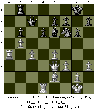 Last move : 1-0 2020 November 30 22:38:55 [Event "FICGS__CHESS__RAPID_B__000352"] [Site "FICGS"] [Date "2020.09.18"] [Round "1"] [White "Gossmann,Ewald"] [Black "Benone,Mateia"] [Result "1-0"] [WhiteElo "1973"] [BlackElo "1816"] 1.e4 c5 2.Nf3 g6 3.d4 cxd4 4.Nxd4 Bg7 5.c4 Nc6 6.Be3 Nf6 7.Nc3 O-O 8.Be2 d6 9.O-O Bd7 10.h3 Nxd4 11.Bxd4 Bc6 12.Qc2 Nd7 13.Bxg7 Kxg7 14.b4 b6 15.Qd2 a5 16.a3 Nf6 17.f3 Qc7 18.Rac1 Rfc8 19.Rfd1 axb4 20.axb4 Ra3 21.Qd4 Rb3 22.b5 Bd7 23.Na4 Rb8 24.Ra1 Rb4 25.Qe3 Kg8 26.Qd2 Rxa4 27.Rxa4 Be6 28.Qe3 1-0 Follow this game move after move (download)A thorough understanding of the typical mating continuations makes the most complicated sacrificial combinations leading up to them not only not difficult, but almost a matter of course. (Siegbert Tarrasch) Ein Großmeister muß tausende Partien in seinem Kopf speichern, denn diese sind für Ihn, was die Worte der Muttersprache für gewöhnliche Leute sind, oder Noten für Musiker... (Garry Kasparov) Aún el Rey más flojo huye despavorido ante la amenaza de un Jaque doble. (Aaron Nimzowitsch) Ce qui caractérise les parties de combat, c'est que si le défenseur a constamment de difficiles problèmes à résoudre, l'attaquant doit chercher sans relâche de nouvelles possibilités d'attaque. (Koblentz) Luck never gives; it only lends. (Swedish proverb)