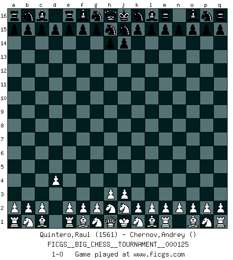 Last move : 1-0 2020 October 19 9:20:43 [Event "FICGS__BIG_CHESS__TOURNAMENT__000125"] [Site "FICGS"] [Date "2020.09.19"] [Round "1"] [White "Quintero,Raul"] [Black "Chernov,Andrey"] [Result "1-0"] [WhiteElo "1561"] [BlackElo ""] 1.d2-d4 1-0 This big chess game has been lost on time (started : 2020.09.19 5:44:55) Follow this game move after move (download)First-class players lose to second-class players because second-class players sometimes play a first-class game. (Siegbert Tarrasch) Jede Eröffnung ist gut genug um gespielt zu werden, wenn nur ihr Ruf schlecht genug ist. (Savielly Grigorievitsch Tartakower) La vida es como un juego de Ajedrez, cambiando con cada movimiento. (Proverbio Chino) Je ne suis pas le dernier à jouer lâchement des coups douteux pendant le zeïtnot de l'adversaire pour l'achever: en effet les coups qui font le plus peur sont ceux que l'on ne comprend pas. Je me fais souvent peur quand je joue. (Un professeur anonyme) Chess is everything: art, science and sport. (Anatoly Karpov)