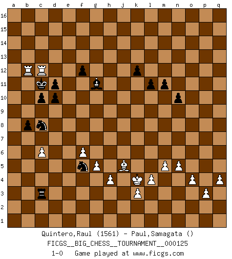 Last move : 1-0 2021 March 3 11:28:16 [Event "FICGS__BIG_CHESS__TOURNAMENT__000125"] [Site "FICGS"] [Date "2020.09.19"] [Round "1"] [White "Quintero,Raul"] [Black "Paul,Samagata"] [Result "1-0"] [WhiteElo "1561"] [BlackElo ""] 1.h2-g4 b15-b13 2.b2-b3 o15-o14 3.c1-b2 c16-b15 4.p1-o3 n15-n13 5.p2-p3 c15-c13 6.o1-p2 e15-e13 7.m2-m4 m15-m13 8.l1-o4 f15-f13 9.q1-p1 g15-g13 10.o3-n5 b15-p2 11.p1-p2 p15-p14 12.j2-k4 l15-l13 13.e2-e4 k15-k13 14.h1-q9 l16-k15 15.f1-e2 h15-k14 16.g4-j5 d15-d13 17.e2-o11 o16-p15 18.f2-f4 p16-n15 19.n5-l6 g16-f14 20.f4-f5 f14-g12 21.a2-a4 b16-c14 22.c2-c4 e13-e12 23.g2-g4 h16-b10 24.a1-a3 n13-n12 25.o11-h5 a15-a13 26.q9-k3 a13-a12 27.b2-c3 a12-a11 28.b3-b4 c14-e13 29.b4-b5 b13-b12 30.g1-f3 e13-d11 31.o2-o3 k16-l14 32.g4-g5 c13-c12 33.c3-f6 b10-d10 34.h3-h4 b12-b11 35.a4-a5 d10-d6 36.f6-e5 d6-g9 37.a3-b3 b11-b10 38.b1-c3 a11-a10 39.n2-n4 k14-j12 40.m4-m5 f16-c13 41.p2-m2 m13-m12 42.h5-g6 n12-n11 43.d2-d4 a10-a9 44.c4-c5 g9-e9 45.b5-b6 e9-h9 46.b3-b2 h9-c4 47.e1-c1 c4-d3 48.k3-h5 h14-h13 49.k1-h2 d3-e3 50.j1-j2 l14-k12 51.m1-e1 e3-d3 52.b2-d2 d3-a6 53.c1-a1 o14-o13 54.c3-d5 c13-f10 55.d5-c7 a6-c8 56.h2-g4 k12-j10 57.g4-f6 j10-h8 58.g6-h7 l13-l12 59.j2-j1 j15-g14 60.k2-k3 n15-m13 61.l2-l4 m13-k12 62.a5-a6 k12-j10 63.b6-b7 c8-f8 64.c7-e6 f8-c11 65.j5-g6 m12-m11 66.k4-j6 j12-g11 67.h7-d11 e12-d11 68.j6-h8 j10-h8 69.g6-h8 f10-h8 70.f6-g4 h8-e5 71.g4-e5 g11-f9 72.h5-j5 c11-c10 73.j5-j4 c10-f10 74.j1-k2 j16-h15 75.k2-l2 g12-h10 76.a6-a7 d13-d12 77.b7-b8 a9-b8 78.a7-b8 h15-h14 79.d2-a2 p15-h8 80.a2-a16 e16-a16 81.a1-a16 m16-a16 82.l2-k1 a16-a3 83.m2-b2 q16-a16 84.f5-f6 f10-a5 85.j4-f1 a5-c3 86.e1-b1 k15-o11 87.o4-m6 o11-f3 88.e5-f3 c3-f3 89.f1-f3 a3-f3 90.l6-j5 a16-a3 91.j5-g6 h8-f10 92.g6-e5 f3-e3 93.e5-c4 g14-h12 94.c4-a3 e3-a3 95.b2-b3 a3-a2 96.b3-b2 a2-a3 97.k1-k2 h12-f11 98.b2-b3 a3-a6 99.d4-d5 h10-g8 100.b3-b7 f9-d8 101.e6-d8 f10-d8 102.b1-b2 d8-f10 103.k2-l3 f11-e9 104.e4-e5 e9-c8 105.b7-q7 a6-a5 106.q7-q8 g8-e9 107.q8-q15 e9-c10 108.b8-b9 c10-a9 109.b2-c2 a9-b7 110.m6-h10 f13-f12 111.q15-p15 a5-a3 112.c5-c6 b7-a9 113.l3-k2 a3-d3 114.p15-p14 d3-d5 115.p14-o14 d5-e5 116.o14-o13 e5-b5 117.o13-n13 n11-n10 118.n13-n14 b5-b9 119.h10-k12 f10-j13 120.k12-m14 b9-q9 121.k2-l3 q9-e9 122.m14-k16 h14-h15 123.n14-n15 h15-g14 124.n15-j15 e9-j9 125.j15-j14 g14-f13 126.j14-c14 c12-c11 127.c14-c13 f13-e12 128.c13-g13 j9-j3 129.o3-o4 k13-k12 130.g13-h13 c8-d6 131.l3-k4 j3-j12 132.k4-l3 j13-g11 133.h13-h15 d11-d10 134.h15-e15 e12-d11 135.e15-e6 d6-f5 136.e6-e4 j12-j3 137.k16-q10 j3-h3 138.q10-p11 l12-l11 139.p11-j5 h3-d3 140.n4-n5 b10-b9 141.l3-k4 c11-c10 142.c2-a2 a9-c8 143.a2-a11 d11-c12 144.a11-a2 b9-b8 145.q2-q4 d12-d11 146.e4-e12 c12-b11 147.a2-a12 b11-b10 148.e12-d12 d3-c3 149.a12-b12 b10-c11 150.d12-c12 1-0 Follow this game move after move (download)Fischer Chess play was always razor-sharp, rational and brilliant. One of the best ever. (Dave Regis) Der Bart als Geschlechtszeichen mitten im Gesicht ist obszön. Daher gefällt er den Weibern. [Zugegeben, kein Schachzitat, aber unglaublich originell] (Arthur Schopenhauer) Cuando tu no sabes absolutamente que mas hacer, es tiempo de entrar en pánico. (John van der Wiel) J'apprécie les joueurs d'est-indienne, c'est grâce à eux que je nourris ma famille depuis tant d'années. (Petrosian) No enterprise is more likely to succeed than one concealed from the enemy until it is ripe for execution. (Niccolo Machiavelli)