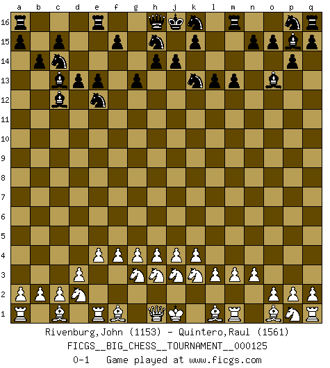Last move : 0-1 2020 November 20 12:4:45 [Event "FICGS__BIG_CHESS__TOURNAMENT__000125"] [Site "FICGS"] [Date "2020.09.19"] [Round "1"] [White "Rivenburg,John"] [Black "Quintero,Raul"] [Result "0-1"] [WhiteElo "1153"] [BlackElo "1561"] 1.h3-h4 g16-f14 2.j3-j4 p15-p14 3.g2-g4 o16-p15 4.k2-k4 b15-b14 5.g1-h3 c16-a14 6.j2-g3 b16-c14 7.h2-k3 e15-e13 8.k1-j3 d15-d13 9.e2-e3 m15-m13 10.f2-f4 l16-o13 11.d2-d3 g15-g13 12.e3-e4 f14-e12 13.l2-l3 j15-k13 14.m2-m3 f16-c13 15.n2-n3 l15-l13 16.b1-d2 a14-c12 0-1 This big chess game has been lost on time (started : 2020.09.19 5:44:55) Follow this game move after move (download)The essence of Chess is thinking about what Chess is. (David Bronstein) Ich habe Kasparov in Rente geschickt. (Veselin Topalov) El Jaque al descubierto es el bombardero del tablero. (Reuben Fine) Aidez vos pièces, elles vous aideront. (Paul Morphy) I've never seen so many men wasted so badly. (Blondie in The Good, The Bad and The Ugly)