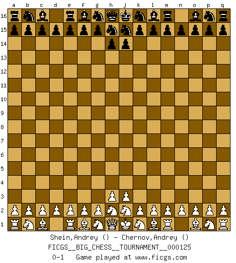 Last move : 0-1 2020 October 19 9:20:43 [Event "FICGS__BIG_CHESS__TOURNAMENT__000125"] [Site "FICGS"] [Date "2020.09.19"] [Round "1"] [White "Shein,Andrey"] [Black "Chernov,Andrey"] [Result "0-1"] [WhiteElo ""] [BlackElo ""] 0-1 This big chess game has been lost on time (started : 2020.09.19 5:44:55) Follow this game move after move (download)Of all my Russian books, the defense contains and diffuses the greatest 'warmth' which may seem odd seeing how supremely abstract Chess is supposed to be. (Vladimir Nabokov) Gewinnen beim Schach fördert das Selbstvertrauen. Beim Sex spüre ich sowas nicht... (Garry Kasparov) Solo puedes ser bueno en el Ajedrez si amas al juego. (Bobby Fischer) Votre seul travail dans les ouvertures est d'obtenir un milieu de partie jouable. (Lajos Portish) There are two major products that came out of Berkeley: LSD and UNIX. We do not believe this is to be a coincidence. (Jeremy S. Anderson)
