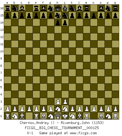 Last move : 0-1 2020 October 19 9:20:43 [Event "FICGS__BIG_CHESS__TOURNAMENT__000125"] [Site "FICGS"] [Date "2020.09.19"] [Round "1"] [White "Chernov,Andrey"] [Black "Rivenburg,John"] [Result "0-1"] [WhiteElo ""] [BlackElo "1153"] 0-1 This big chess game has been lost on time (started : 2020.09.19 5:44:55) Follow this game move after move (download)First-class players lose to second class players because second-class players sometimes play a first-class game. (Tarrasch) Garry Kasparov war erst in der Großmeister-Organisation GMA, dann in der Profischach-Vereinigung PCA, zum Schluss kehrte er wieder in den Schoß der FIDE zurück. Aber gut, manche Leute sind flexibel (Viswanathan Anand) Repentinamente, me resultaba obvio en mi analisis que yo había pasado por alto lo que Fischer había visto en el tablero con la mas grande facilidad. (Mikhail Botvinnik) Il a essayé de se convaincre qu'il pourrait empêcher toutes les erreurs et ne jamais perdre. L'horreur ! Gary Kasparov au sujet de Robert Fischer. If only people were all showed a certain minimum level of niceness; if only people didn't retract verbal draw offers (without draw box ticked) on ficgs; if only people didn't kill; if only people didn't run concentration / extermination camps, if only people didn't drop nuclear bombs on Hiroshima and Nagasaki, and so on - it would be a much more beautiful world. But sadly, things are not so... (Normajean Yates)