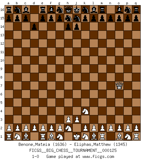 Last move : 1-0 2020 October 23 22:44:32 [Event "FICGS__BIG_CHESS__TOURNAMENT__000125"] [Site "FICGS"] [Date "2020.09.19"] [Round "1"] [White "Benone,Mateia"] [Black "Eliphas,Matthew"] [Result "1-0"] [WhiteElo "1636"] [BlackElo "1345"] 1.j2-k4 d15-d14 2.h1-o7 1-0 This big chess game has been lost on time (started : 2020.09.19 5:44:55) Follow this game move after move (download)Botvinnik tried to take the mystery out of Chess, always relating it to situations in ordinary life. He used to call Chess a typical inexact problem similar to those which people are always having to solve in everyday life. (Garry Kasparov) Über Karpov: Er war und ist ein Vertreter der russischen Reaktionäre. Das steckt tief in seiner Seele, wehalb ich nicht nett mit ihm umgehen kann. (Viktor Kortschnoi) Siempre es mucho mejor sacrificar las piezas de tu oponente. (Savielly Tartakover) Il n'y a pas de prix trop élevé au scalp de l'ennemi. (Koblentz) All art requires courage. (Anne Tucker)