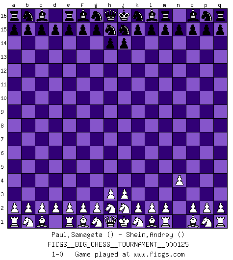 Last move : 1-0 2020 October 19 9:20:43 [Event "FICGS__BIG_CHESS__TOURNAMENT__000125"] [Site "FICGS"] [Date "2020.09.19"] [Round "1"] [White "Paul,Samagata"] [Black "Shein,Andrey"] [Result "1-0"] [WhiteElo ""] [BlackElo ""] 1.n2-n4 1-0 This big chess game has been lost on time (started : 2020.09.19 5:44:55) Follow this game move after move (download)The most important feature of the Chess position is the activity of the pieces. This is absolutely fundamental in all phases of the game: Opening, Middlegame and especially Endgame. The primary constraint on a piece's activity is the Pawn structure. (Michael Stean) Kleine Schachspieler machen Mist, und große Schachspieler machen Mist, aber große machen weniger Mist. (Fritz Sämisch) No nos podemos resistir a la fascinación de un sacrificio ya que la pasión por los sacrificios es parte de la naturaleza de un jugador de Ajedrez. (Rudolf Spielman) Même si l'adversaire joue le coup analysé précédemment, recommencez l'analyse en voyant la nouvelle position. Première règle de Blumenfeld A good programmer is someone who always looks both ways before crossing a one-way street. (Doug Linder)