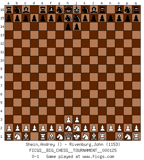 Last move : 0-1 2020 October 19 9:20:43 [Event "FICGS__BIG_CHESS__TOURNAMENT__000125"] [Site "FICGS"] [Date "2020.09.19"] [Round "1"] [White "Shein,Andrey"] [Black "Rivenburg,John"] [Result "0-1"] [WhiteElo ""] [BlackElo "1153"] 0-1 This big chess game has been lost on time (started : 2020.09.19 5:44:55) Follow this game move after move (download)The hallmark of the artist is simplicity. (Larry Evans) Den Ruhm habe ich schon, jetzt brauche ich noch das Geld. (Wilhelm Steinitz) Bobby Fischer es el jugador de Ajedrez mas grande que jamás haya existido. (Ken Smith) Je fais ceci parce que dans cinquante coups j'obtiendrai cela; je m'appelle Mikhail Moisevitch Botvinnik. (Botvinnik) O divine art of subtlety and secrecy! Through you we learn to be invisible, through you inaudible and hence we can hold the enemy's fate in our hands. (Sun Tzu)