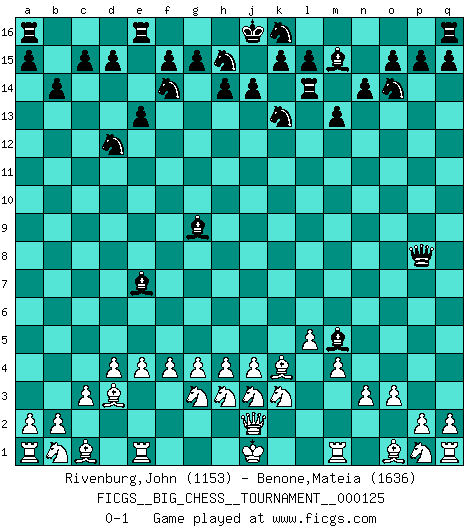 Last move : 0-1 2020 November 20 12:4:45 [Event "FICGS__BIG_CHESS__TOURNAMENT__000125"] [Site "FICGS"] [Date "2020.09.19"] [Round "1"] [White "Rivenburg,John"] [Black "Benone,Mateia"] [Result "0-1"] [WhiteElo "1153"] [BlackElo "1636"] 1.h3-h4 j15-k13 2.j3-j4 b15-b14 3.g2-g4 p16-o14 4.k2-k4 n15-n14 5.j2-g3 c16-b15 6.g1-h3 b16-c14 7.k1-j3 g16-f14 8.h2-k3 o16-g9 9.o2-o3 m15-m13 10.n2-n3 h16-m12 11.m2-m4 m16-m14 12.l2-l4 e15-e13 13.c2-c3 f16-b12 14.f2-f4 m14-l14 15.e2-e4 l16-m15 16.d2-d4 m12-p9 17.f1-d3 b12-k4 18.h1-h2 k4-f8 19.l4-l5 c14-d12 20.l1-m2 f8-e7 21.m2-k4 p9-p8 22.h2-j2 b15-m5 0-1 This big chess game has been lost on time (started : 2020.09.19 5:44:55) Follow this game move after move (download)If I win a tournament, I win it by myself. I do the playing. Nobody helps me. (Bobby Fischer) Schach ist mein Leben, meine Leidenschaft, was ich gelernt habe und seit meinem 14. Lebensjahr profimässig praktiziere. Darauf zu verzichten, würde mir sehr schwer fallen. (Viktor Kortschnoi) Combinaciones deslumbrantes son para la mayoría, mover madera es para los pocos. (Georg Kieninger) On a dit que l'homme se distingue de l'animal par le fait qu'il achète plus de livres qu'il ne peut en lire. Je voudrais suggérer qu'inclure à la liste des livres quelques livres d'échecs rendrait la distinction manifeste. (Edward Lasker) I would love to change the world, but they won't give me the source code. (Unknown)