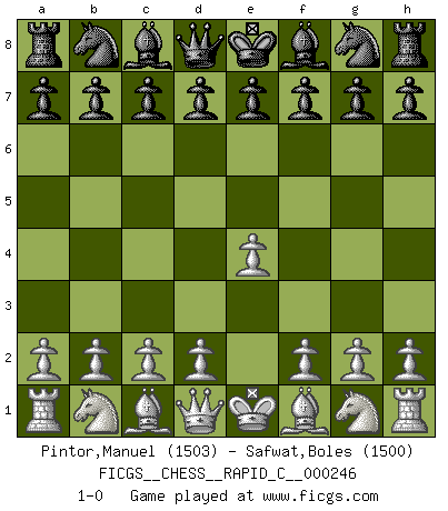 Last move : 1-0 2020 October 21 10:32:55 [Event "FICGS__CHESS__RAPID_C__000246"] [Site "FICGS"] [Date "2020.09.20"] [Round "1"] [White "Pintor,Manuel"] [Black "Safwat,Boles"] [Result "1-0"] [WhiteElo "1503"] [BlackElo "1500"] 1.e4 1-0 This chess game has been lost on time (started : 2020.09.20 19:49:57) King's pawn Opening Player White won this chess game. Follow this game move after move (download)Everything is in a state of flux, and this includes the world of Chess. (Mikhail Botvinnik) Bobby Fischer ist kein Vorbild für die heutige Jugend. (Viktor Kortschnoi) El Ajedrez, como la música, como el amor, tiene el poder de hacer feliz a la gente. (Siegbert Tarrasch) Les pièces de l'échiquier étaient impitoyables. Elles le retenaient, elles l'absorbaient. Il y avait de l'horreur en cela, mais aussi une harmonie unique. Car, qu'y a-t-il dans le monde, à part les échecs ? (V. Nabokov) Over-the-board chess is the favorite of mortals, correspondence chess is the favorite of the gods. (Eduard Dyckhoff)