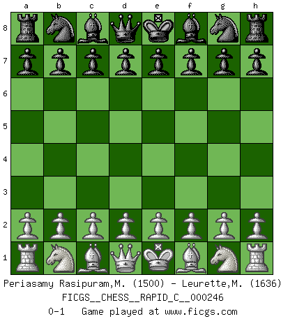 Last move : 0-1 2020 October 21 10:32:55 [Event "FICGS__CHESS__RAPID_C__000246"] [Site "FICGS"] [Date "2020.09.20"] [Round "1"] [White "Periasamy Rasipuram,Muralidharan"] [Black "Leurette,Marc-Antoine"] [Result "0-1"] [WhiteElo "1500"] [BlackElo "1636"] 0-1 This chess game has been lost on time (started : 2020.09.20 19:49:57) Player Black won this chess game. Follow this game move after move (download)I give 98 percent of my mental energy to Chess. Others give only 2 percent. (Bobby Fischer) Wenn Du einsam bist, wenn Du Dich in der Welt wie ein Fremder fühlst, spiele Schach. Das wird Deinen Geist erheben und Dein Ratgeber im Kampf sein. (Aristoteles) Todo lo que importa ante el tablero de Ajedrez son buenas jugadas. (Bobby Fischer) Le thème de l'attaque double intervient d'une manière ou d'une autre dans l'immense majorité des combinaisons. (Youri Averbakh) When you stop learning you start dying. (M. Scott Adams)