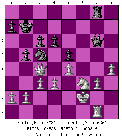Last move : 0-1 2020 October 10 0:38:33 [Event "FICGS__CHESS__RAPID_C__000246"] [Site "FICGS"] [Date "2020.09.20"] [Round "1"] [White "Pintor,Manuel"] [Black "Leurette,Marc-Antoine"] [Result "0-1"] [WhiteElo "1503"] [BlackElo "1636"] 1.e4 e5 2.f4 d6 3.Nf3 Nc6 4.Bc4 Bg4 5.c3 Bxf3 6.Qxf3 Nf6 7.d3 Qd7 8.f5 O-O-O 9.O-O g6 10.fxg6 Be7 11.gxf7 h5 12.Bg5 Ng4 13.Bxe7 Qxe7 14.Nd2 Rdf8 15.h3 Nh6 16.Qxh5 Nd8 17.Rf3 Nhxf7 18.Qg4+ Kb8 19.Raf1 Nh6 20.Qg3 Rhg8 21.Bxg8 Rxg8 22.Qf2 Ne6 23.Kh2 b6 24.g3 Qh7 25.Qe2 Ng4+ 26.Kg2 Rh8 27.h4 Kb7 28.Rf7 Qg6 29.R7f5 Nh6 30.Qh5 Qg7 31.Rf7 Nxf7 32.Qxf7 Qh6 33.Nf3 Rf8 34.Qd7 Rg8 35.Kf2 Qg6 36.Rg1 Nc5 37.Qb5 c6 38.Qc4 b5 0-1 King's gambit Queenside Castling by player Black (move 8) Kingside Castling by player White (move 9) Player Black won this chess game. Follow this game move after move (download)The game of Chess is not merely an idle amusement; several very valuable qualities of the mind are to be acquired and strengthened by it, so as to become habits ready on all occasions; for life is a kind of Chess. (Benjamin Franklin) Obendrein hat der FIDE-Präsident den Revolutionsführer Gaddafi zum »Großmeister« ernannt, am Ende der WM. Das ist lächerlich! (Joel Lautier) El Jaque al descubierto es el bombardero del tablero. (Reuben Fine) Il (Jacob Murray) ne joue pas pour le bon coup, mais pour le meilleur. (Eloi Relange) A belief is an idea the mind possesses, an idea that possesses the mind. (Robert Oxden Bolton)