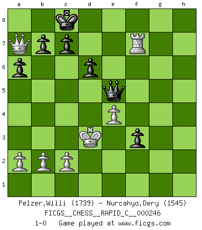 Last move : 1-0 2020 November 4 19:50:40 [Event "FICGS__CHESS__RAPID_C__000246"] [Site "FICGS"] [Date "2020.09.20"] [Round "1"] [White "Pelzer,Willi"] [Black "Nurcahyo,Dery"] [Result "1-0"] [WhiteElo "1739"] [BlackElo "1545"] 1.e4 e5 2.Nf3 d6 3.d4 exd4 4.Nxd4 Nf6 5.Nc3 h6 6.Be2 Be6 7.Nxe6 fxe6 8.Bh5+ Ke7 9.Bf3 Nc6 10.g4 g5 11.h4 Bg7 12.Be3 Ne5 13.Qe2 a6 14.hxg5 hxg5 15.Bxg5 Rxh1+ 16.Bxh1 Kd7 17.O-O-O Qh8 18.Bxf6 Bxf6 19.f4 Ng6 20.Qe3 e5 21.Nd5 exf4 22.Nxf6+ Qxf6 23.Qb3 Rb8 24.Rd5 Ne5 25.Bf3 Qh4 26.Qc3 Re8 27.Rd1 Qg3 28.Rf1 Re7 29.Be2 Qg2 30.Kd1 Rf7 31.Qe1 Nxg4 32.Bxg4+ Qxg4+ 33.Kd2 f3 34.Qe3 Rf4 35.Rg1 Qh4 36.Rg7+ Kc8 37.Qa7 Qh2+ 38.Kc3 Rf7 39.Rxf7 Qe5+ 40.Kd3 1-0 Follow this game move after move (download)Who is your opponent tonight, tonight I am playing against the Black pieces. (Akiba Rubinstein) Fallen sollten polizeilich verboten werden. (Savielly Grigorievitsch Tartakower) Las Aperturas te enseñan aperturas. ¡Los Finales te enseñan Ajedrez!. (Stephan Gerzadowicz) Je menace de comprendre la position. (Anonyme) The weakness of an artist is dogma. (Josh Waitzkin)