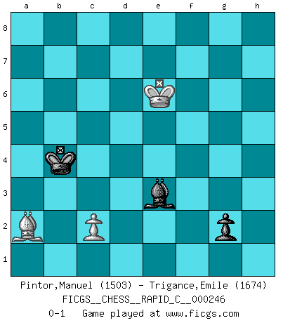 Last move : 0-1 2020 October 6 16:41:39 [Event "FICGS__CHESS__RAPID_C__000246"] [Site "FICGS"] [Date "2020.09.20"] [Round "1"] [White "Pintor,Manuel"] [Black "Trigance,Emile"] [Result "0-1"] [WhiteElo "1503"] [BlackElo "1674"] 1.e4 Nc6 2.f4 d5 3.exd5 Qxd5 4.Nc3 Qd8 5.Bc4 Nf6 6.d4 Qxd4 7.Bb3 Bg4 8.Nf3 Qxd1+ 9.Nxd1 Bxf3 10.gxf3 e6 11.O-O Nd4 12.Nc3 Bc5 13.Kh1 O-O-O 14.Ba4 Nf5 15.Ne4 Nxe4 16.fxe4 Ne3 17.Bxe3 Bxe3 18.Rad1 Rxd1 19.Rxd1 Bxf4 20.Rf1 g5 21.h4 h6 22.Bb3 Rd8 23.Kg2 Rd2+ 24.Kf3 Rh2 25.hxg5 hxg5 26.Re1 Kd7 27.a4 a5 28.Kg4 Rh4+ 29.Kf3 Rh3+ 30.Kg4 Re3 31.Rxe3 Bxe3 32.Bc4 Kd6 33.b3 Kc5 34.Bd3 c6 35.Kh5 b5 36.Kh6 bxa4 37.bxa4 g4 38.Kg7 g3 39.Bf1 f5 40.Kf6 fxe4 41.Ke5 Kb4 42.Bg2 Kxa4 43.Kxe6 Kb4 44.Bxe4 a4 45.Bxc6 a3 46.Bd5 a2 47.Bxa2 g2 0-1 KP : Nimzovich defense Kingside Castling by player White (move 11) Queenside Castling by player Black (move 13) 10 pieces endgame at move 42 : White KBP , Black KBPPPPP WHITE : King + 1 Bishop 1 Pawn BLACK : King + 1 Bishop 5 Pawns 9 pieces endgame at move 43 : White KBP , Black KBPPPP WHITE : King + 1 Bishop 1 Pawn BLACK : King + 1 Bishop 4 Pawns 8 pieces endgame at move 44 : White KBP , Black KBPPP WHITE : King + 1 Bishop 1 Pawn BLACK : King + 1 Bishop 3 Pawns 7 pieces endgame at move 45 : White KBP , Black KBPP WHITE : King + 1 Bishop 1 Pawn BLACK : King + 1 Bishop 2 Pawns 6 pieces endgame at move 47 : White KBP , Black KBP WHITE : King + 1 Bishop 1 Pawn BLACK : King + 1 Bishop 1 Pawn Player Black won this chess game. Follow this game move after move (download)The defensive power of a pinned piece is only imaginary. (Aaron Nimzovich) Je mehr wir mit Computern analysieren, desto mehr glauben wir an Verteidigung. (Vladimir Kramnik) Un entendimiento minucioso de las típicas continuaciones de mate hacen de las mas complicadas combinaciones de sacrificio que conducen hacia ellas no solo no dificiles, sino casi un asunto de rutina. (Siegbert Tarrasch) Soyez une menace à chaque fois que vous vous asseyez pour jouer. (Ken Smith) The leaves of memory seemed to make a mournful rustling in the dark. (Henry Wadsworth Longfellow)