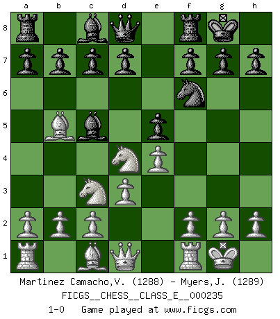 Last move : 1-0 2020 November 6 14:41:20 [Event "FICGS__CHESS__CLASS_E__000235"] [Site "FICGS"] [Date "2020.09.20"] [Round "1"] [White "Martinez Camacho,Victor Hugo"] [Black "Myers,Joe"] [Result "1-0"] [WhiteElo "1288"] [BlackElo "1289"] 1.e4 e5 2.Nf3 Nc6 3.Bb5 Nf6 4.d3 Bc5 5.O-O O-O 6.Nc3 Nd4 7.Nxd4 1-0 This chess game has been lost on time (started : 2020.09.20 19:50:50) Follow this game move after move (download)I had a toothache during the first game. In the second game I had a headache. In the third game it was an attack of rheumatism. In the fourth game, I wasn't feeling well. And in the fifth game? Well, must one have to win every game ? (Siegbert Tarrasch) Über Kasparov: Es ist offensichtlich, daß er in einem totalitären Staat aufwuchs und deshalb zu diktatorischen Zügen neigt. (Viktor Kortschnoi) Siempre es mejor sacrificar los hombres de tu oponente. (Savielly Tartakower) Le plus grand jeu de l'esprit jamais inventé, plus vous l'apprenez, plus vous y prenez du plaisir. (Garry Kasparov) Life is like internet, nothing interesting, but noone want to leave it. (Ilmars Cirulis)