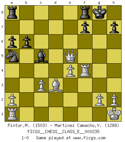 Last move : 1-0 2020 October 16 17:41:30 [Event "FICGS__CHESS__CLASS_E__000235"] [Site "FICGS"] [Date "2020.09.20"] [Round "1"] [White "Pintor,Manuel"] [Black "Martinez Camacho,Victor Hugo"] [Result "1-0"] [WhiteElo "1503"] [BlackElo "1288"] 1.e4 e5 2.f4 d5 3.exd5 c6 4.dxc6 Nxc6 5.Nf3 Bg4 6.c3 Bc5 7.Bc4 Nf6 8.d3 O-O 9.Nbd2 Na5 10.Bb5 exf4 11.b4 Bxf3 12.Qxf3 Qe7+ 13.Ne4 Nxe4 14.dxe4 Bxb4 15.O-O Bc5+ 16.Kh1 a6 17.Bd3 g5 18.Qh5 Qe5 19.Bxf4 gxf4 20.Qxe5 b6 21.Rxf4 1-0 KGD : Nimzovich counter-gambit Kingside Castling by player Black (move 8) Kingside Castling by player White (move 15) Player White won this chess game. Follow this game move after move (download)Every Chess master was once a beginner. (Chernev) Bis zum Jahr 1971 verlief in meiner Schachkariere alles glatt. Dieses dramatische Match [Fischer-Taimanov 6:0] machte mein Leben zur Hölle. (Mark Taimanov) No hay otro maestro que tenga una voluntad terrífica de ganar. Al tablero, el irradía peligro y aún los oponentes mas fuertes tienden a congelarse como liebres cuando olfatean a una pantera. Aún sus debilidades son peligrosas. Con las blancas, su juego de apertura es predecible - te es posible hacer planes en su contra - pero es tan fuerte que tus planes casi nunca funcionan. En el juego medio, su precisión e invención son fabulosas y en finales, tú simplemente no le puedes vencer. (Experto Alemán anónimo) Votre seul travail dans les ouvertures est d'obtenir un milieu de partie jouable. (Lajos Portish) Some people are so afraid to die that they never begin to live. (Henry Van Dyke)