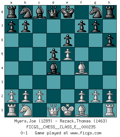 Last move : 0-1 2020 November 4 18:25:29 [Event "FICGS__CHESS__CLASS_E__000235"] [Site "FICGS"] [Date "2020.09.20"] [Round "1"] [White "Myers,Joe"] [Black "Rezack,Thomas"] [Result "0-1"] [WhiteElo "1289"] [BlackElo "1463"] 1.e4 e6 2.e5 d5 3.d4 c5 4.Bd2 cxd4 5.Nf3 h6 6.Nxd4 Bc5 7.Bf4 Bxd4 0-1 This chess game has been lost on time (started : 2020.09.20 19:50:50) Follow this game move after move (download)Fischer is an American Chess tragedy on par with Morphy and Pillsbury. (Mig Greengard) Oft bringt ein stiller Zug das Erdbeben. (Richard Reti) La belleza de un movimiento no se refleja solo en su apariencia, sino en el pensamiento detrás de él. (Siegbert Tarrasch) C'est la seule position que je connaisse où les deux camps sont mals. Propos prêtés à V. Anand. A good teacher is like a candle - it consumes itself to light the way for others. (Author unknown)
