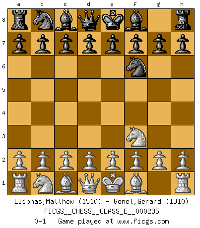 Last move : 0-1 2020 October 31 19:3:29 [Event "FICGS__CHESS__CLASS_E__000235"] [Site "FICGS"] [Date "2020.09.20"] [Round "1"] [White "Eliphas,Matthew"] [Black "Gonet,Gerard"] [Result "0-1"] [WhiteElo "1510"] [BlackElo "1310"] 1.Nf3 Nf6 0-1 This chess game has been lost on time (started : 2020.09.20 19:50:50) Reti Opening Player Black won this chess game. Follow this game move after move (download)Chess is a sea in which a gnat may drink and an elephant may bathe. (Hindu proverb) Sicherlich können nur Meister einen Stil haben. Daß ein nicht-Meister auch nur ein einziges Mal in seinem Leben eine Partie folgerecht durchführte, habe ich niemals bemerkt. (Emanuel Lasker) El muchacho (en ese entonces un niño de 12 años llamado Anatoly Karpov) no tiene ni idea de lo que es el Ajedrez y no hay futuro en absoluto para el en esta profesión. (Mikhail Botvinnik) Je ne crois pas en la psychologie, je crois aux bons coups. (Robert Fischer) No enterprise is more likely to succeed than one concealed from the enemy until it is ripe for execution. (Niccolo Machiavelli)