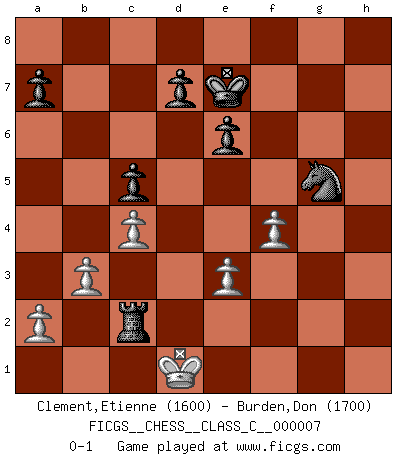 Last move : 0-1 2006 August 10 11:3:57 [Event "FICGS__CHESS__CLASS_C__000007"] [Site "FICGS"] [Date "2006.06.21"] [Round "1"] [White "Clement,Etienne"] [Black "Burden,Don"] [Result "0-1"] [WhiteElo "1600"] [BlackElo "1700"] 1.d4 Nf6 2.c4 e6 3.Nf3 b6 4.Nc3 Bb7 5.Bg5 h6 6.Bh4 Be7 7.Qc2 Bxf3 8.gxf3 c5 9.Bxf6 Bxf6 10.dxc5 bxc5 11.O-O-O Nc6 12.Ne4 Be7 13.Rg1 g5 14.Qd2 Qc7 15.h4 f5 16.Nd6+ Bxd6 17.Qxd6 Qxd6 18.Rxd6 Ke7 19.Rd2 Rag8 20.hxg5 hxg5 21.e3 Ne5 22.Be2 Rg6 23.Rgd1 f4 24.Rf1 Rh2 25.Kd1 Rgh6 26.Rc2 Rh1 27.Ke1 g4 28.fxg4 f3 29.g5 fxe2 30.Rxh1 Rxh1+ 31.Kxe2 Rh2 32.b3 Nf7 33.Kd1 Nxg5 34.f4 Rxc2 0-1 Queen's Indian : 4.Nc3 Queenside Castling by player White (move 11) Player Black won this chess game. Follow this game move after move (download)The hallmark of the artist is simplicity. (Larry Evans) Bis zum Jahr 1971 verlief in meiner Schachkariere alles glatt. Dieses dramatische Match [Fischer-Taimanov 6:0] machte mein Leben zur Hölle. (Mark Taimanov) El Ajedrez es el gimnasio de la mente. (Blaise Pascal) La vérité est comme le meilleur coup aux échecs : elle existe, mais il faut la chercher. (Arturo Perez-Reverte) A mistake is only a mistake if you let it happen twice. Otherwise it is a learning experience. (Daniel Parmet)