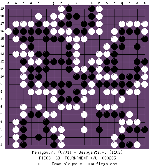 Last move : 0-1 2021 January 12 19:26:13 [Event "FICGS__GO__TOURNAMENT_KYU__000205"] [Site "FICGS"] [Date "2020.09.22"] [Round "1"] [Black "Kehayov,Yulian"] [White "Osipyants,Vladimir"] [Result "0-1"] [Rating 1 "0701"] [Rating 2 "1102"] 1.c3 q4 2.d16 q17 3.q10 n16 4.d9 d13 5.r3 r4 6.s3 s4 7.t3 q3 8.q2 p2 9.r1 p1 10.q1 s1 11.q16 p16 12.q15 r17 13.r16 r8 14.r10 p8 15.p5 n6 16.n5 o6 17.o5 p6 18.k16 c10 19.c12 d12 20.d11 c11 21.d10 c9 22.d14 c14 23.d15 c17 24.c16 d17 25.f15 f17 26.h17 g16 27.g15 h16 28.h15 j16 29.j17 k15 30.l16 j15 31.g12 k12 32.p13 l5 33.n3 l3 34.f3 c6 35.h12 d8 36.g9 e9 37.e11 e12 38.f11 f8 39.f9 g8 40.h9 l15 41.k18 m16 42.m17 n18 43.m18 n17 44.m19 n13 45.o12 n12 46.o11 n11 47.f12 c13 48.f13 h3 49.k10 g5 50.f4 f5 51.e5 e6 52.d5 b4 53.c4 b3 54.c2 b2 55.c1 b1 56.g2 h2 57.g1 h1 58.k8 l7 59.k7 l8 60.l9 m9 61.m10 n10 62.m11 k6 63.h7 h6 64.j7 g7 65.h8 g3 66.e2 c5 67.q5 r5 68.e13 b17 69.b16 b15 70.e16 a16 71.c15 b13 72.f16 g17 73.j14 k14 74.j13 k13 75.j12 k11 76.j11 m12 77.n9 m8 78.o9 o10 79.p9 p10 80.q9 o13 81.p12 p15 82.p14 o14 83.e10 e8 84.q8 q7 85.q14 s17 86.s16 t16 87.t15 t17 88.s14 s9 89.s10 t10 90.s11 o8 91.r9 s8 92.p11 t11 93.t12 t9 94.s12 n19 95.e17 e18 96.l10 h18 97.j18 g18 98.l17 l11 99.j9 j6 100.j19 h19 0-1 Follow this game move after move (download)The intersection is rarely neutral. (Pierre Audouard) They misunderestimated me. (George W. Bush, Bentonville nov. 6, 2000)